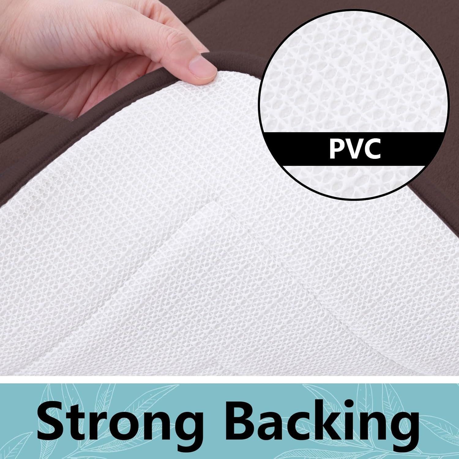 - PVC Backing : Our bath mat features a non-slip backing made from good quality mesh PVC that helps ensure you and your family stay secure. WARNING: Place mat on CLEAN DRY SMOOTH FLOOR only. Water under bath mats can cause it to slip. Keep bottom of mat dry. Before using bath carpet, test with foot to ensure it doesn't move
