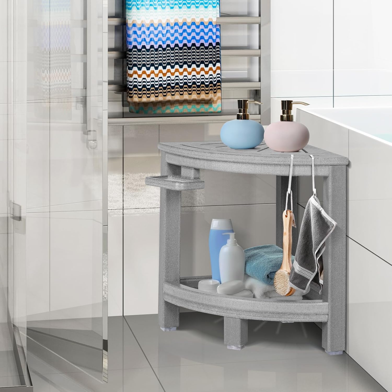 2-Tier Corner Shower Stool with Hooks & Soap Dish, HDPE Shower Bench for Shaving Legs, Wood-Like Shower Stool for Inside Shower with Non-Slip Foot Pads, Waterproof Shower Foot Rest (Grey)