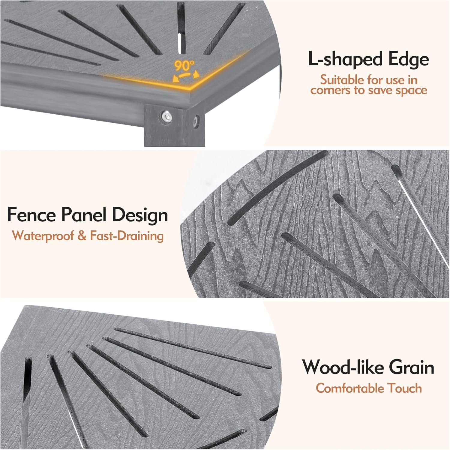 - ăHDPE MaterialăMade of High-density polyethylene (HDPE) and stainless steel hardware, it will not crack, scratch, rust, or fade over time. The triangular structure and the thickened legs ensure the stability of the corner shower bench. In addition, the surface is designed with faux wood grain, making it sturdy and durable while maintaining a vintage and elegant aesthetic.