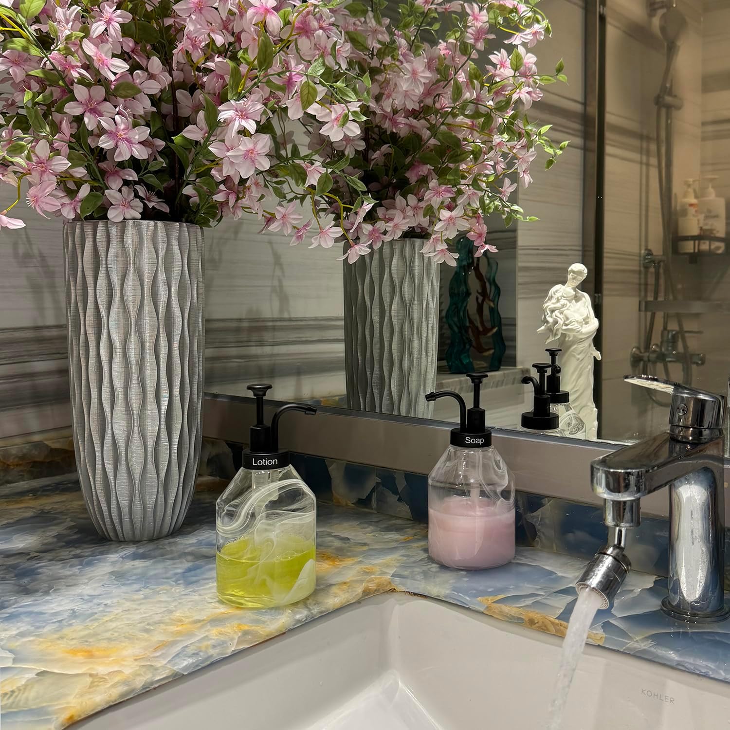 - π ORIGINAL NEW DESIGN DECORATIVE CRYSTAL SOAP DISPENSER: Modern bathroom soap pump dispenser with white 3D Smoke pattern elegant and beautiful. Easily match any vanity decor or bathroom accessories. Crystal soap dispenser great for Hotel Club Ornaments, apartments, RVs.