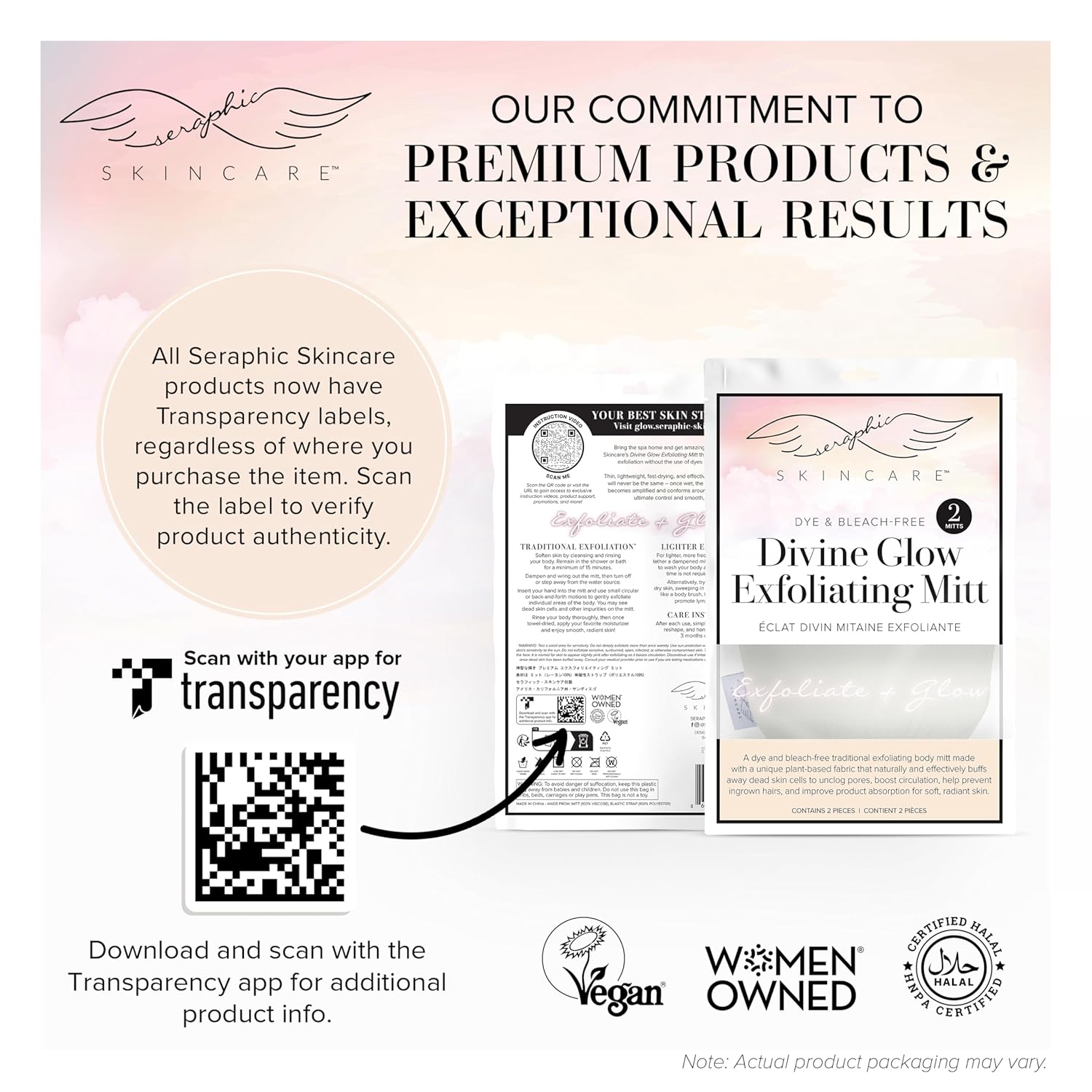 - BETTER THAN LOOFAHS OR CHEMICAL EXFOLIANTS – Loofahs and chemical exfoliants don’t have the skin-gripping power of our Divine Glow exfoliator glove, meaning they’re just not as effective at removing dead skin. Our body mitts are certified vegan and Halal, offering a naturally effective alternative – they’re rough enough to deeply exfoliate while soft enough to buff and smooth. Plus, our product packaging includes step-by-step instructions for customized results!