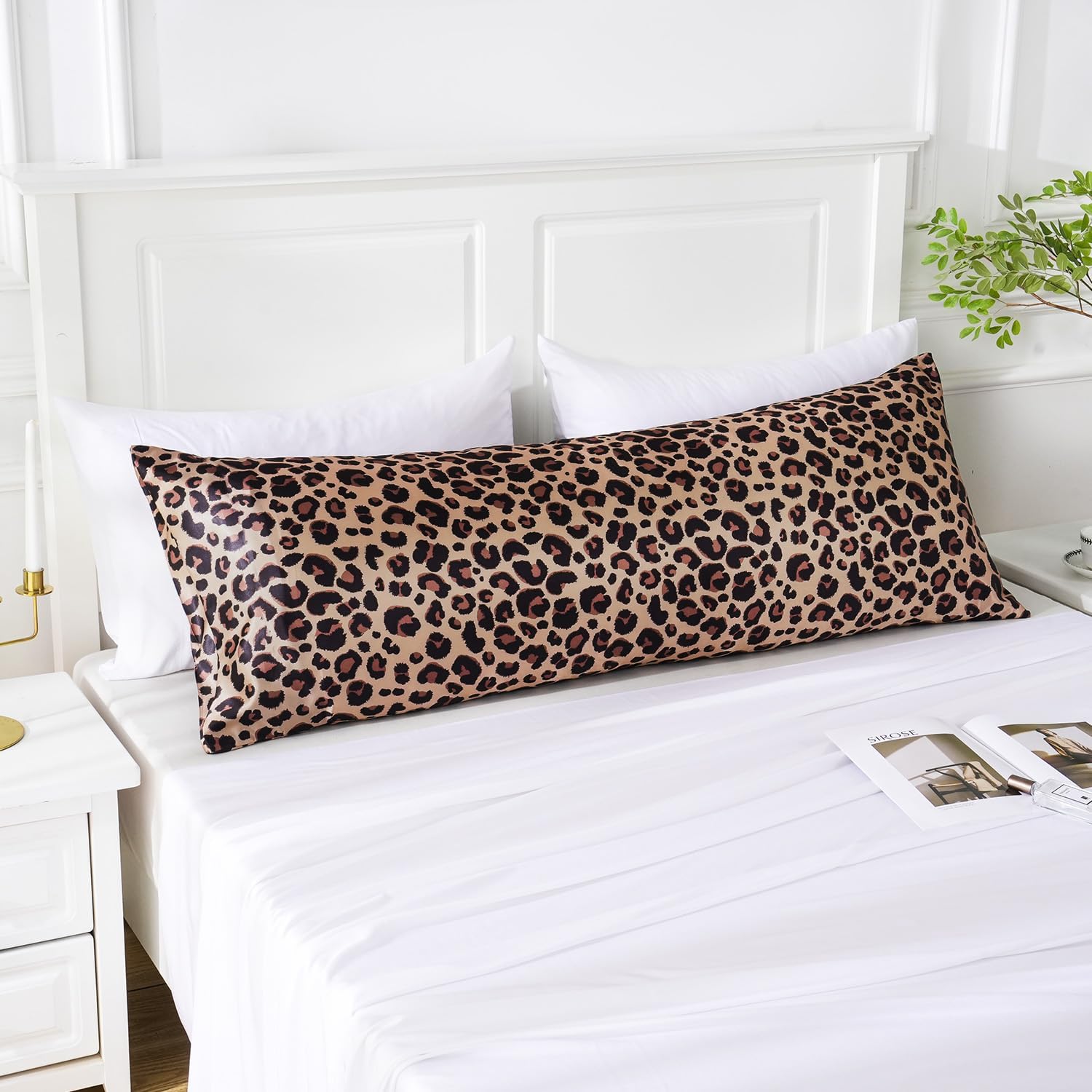 MR&HM Satin Body Pillow Cover, Soft and Breathable Body Pillow Case with Envelope Closure, Cooling and Silky Long Pillowcase for Hair and Skin,Grey (20x54, Brown Leopard)