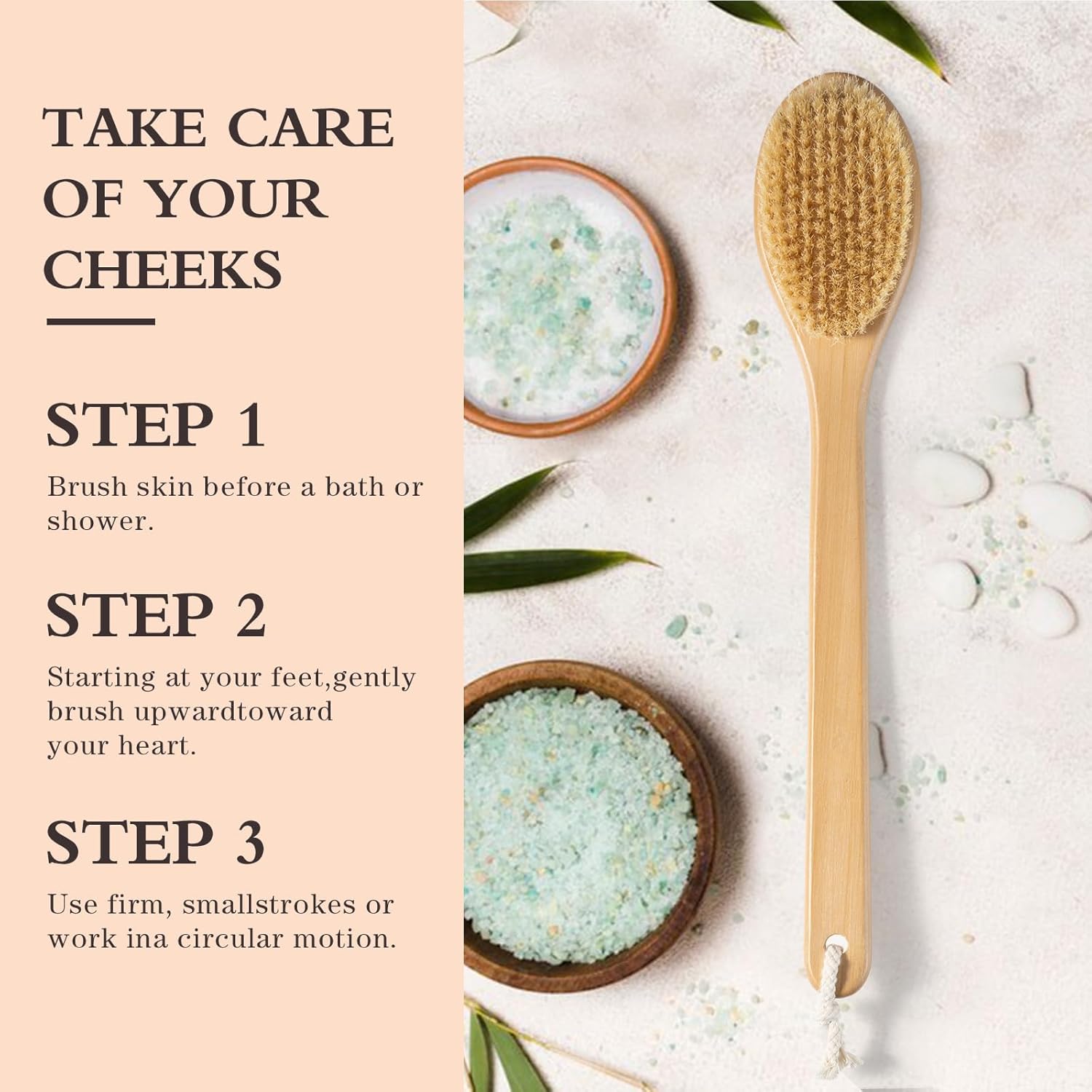 Bamboo Long Handle Back Scrubber Brush,Dry Body Scrubber for Dry Skin, Blood Circulation, Cellulite Treatment,Dry Brush Suitable for All Kinds of Skin with Soft and Stiff Bristles