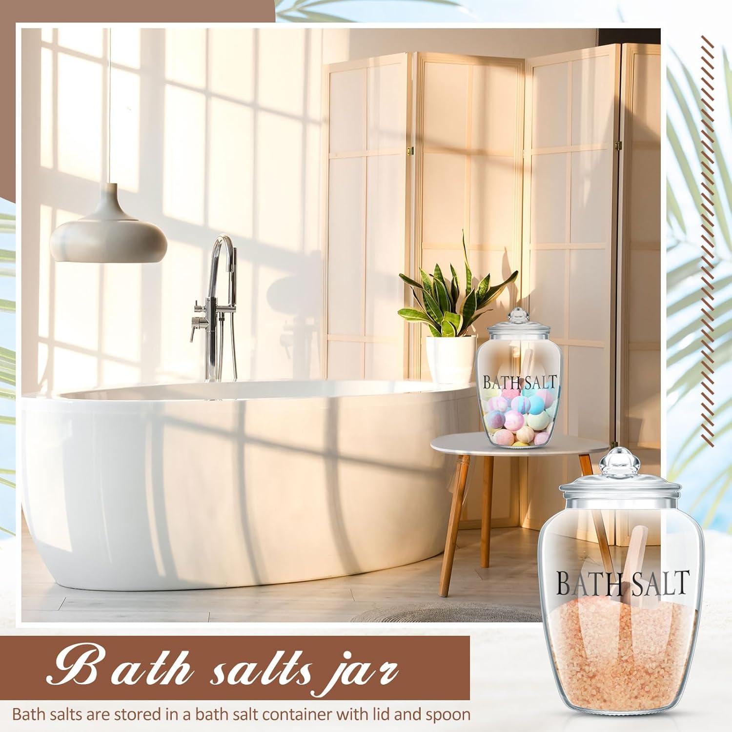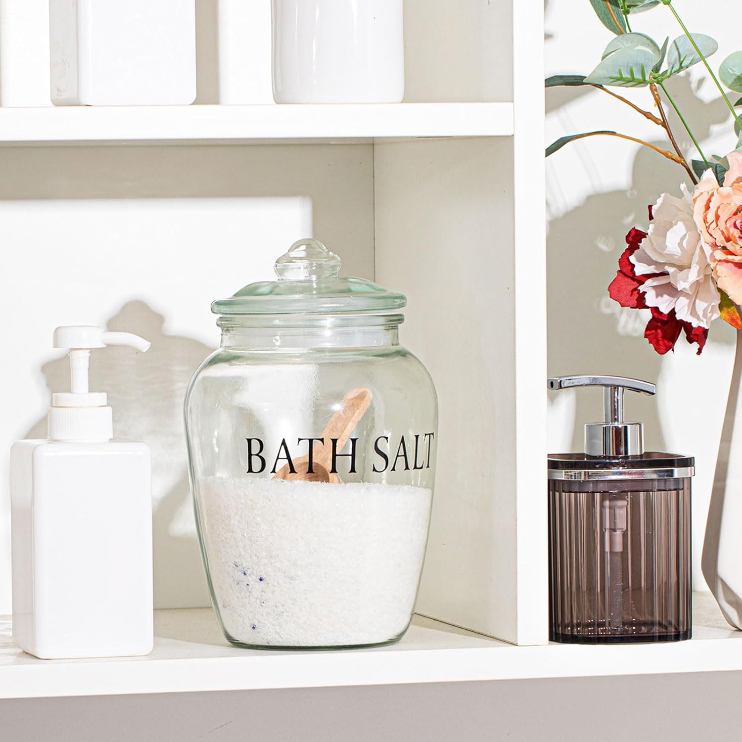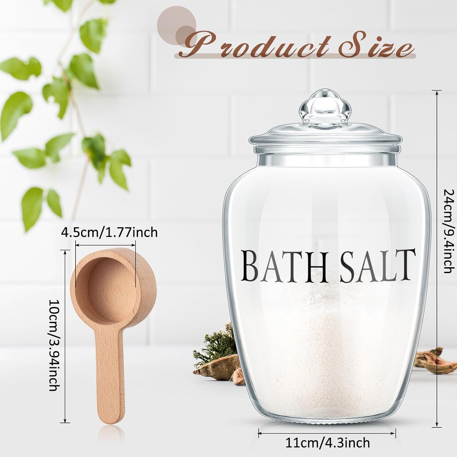 - Quality Reliable Longevity: our bath salt jars with scoop are made from quality materials; The glass container ensures longevity, while the wooden scoop adds a rustic elegance to your bathroom storage items