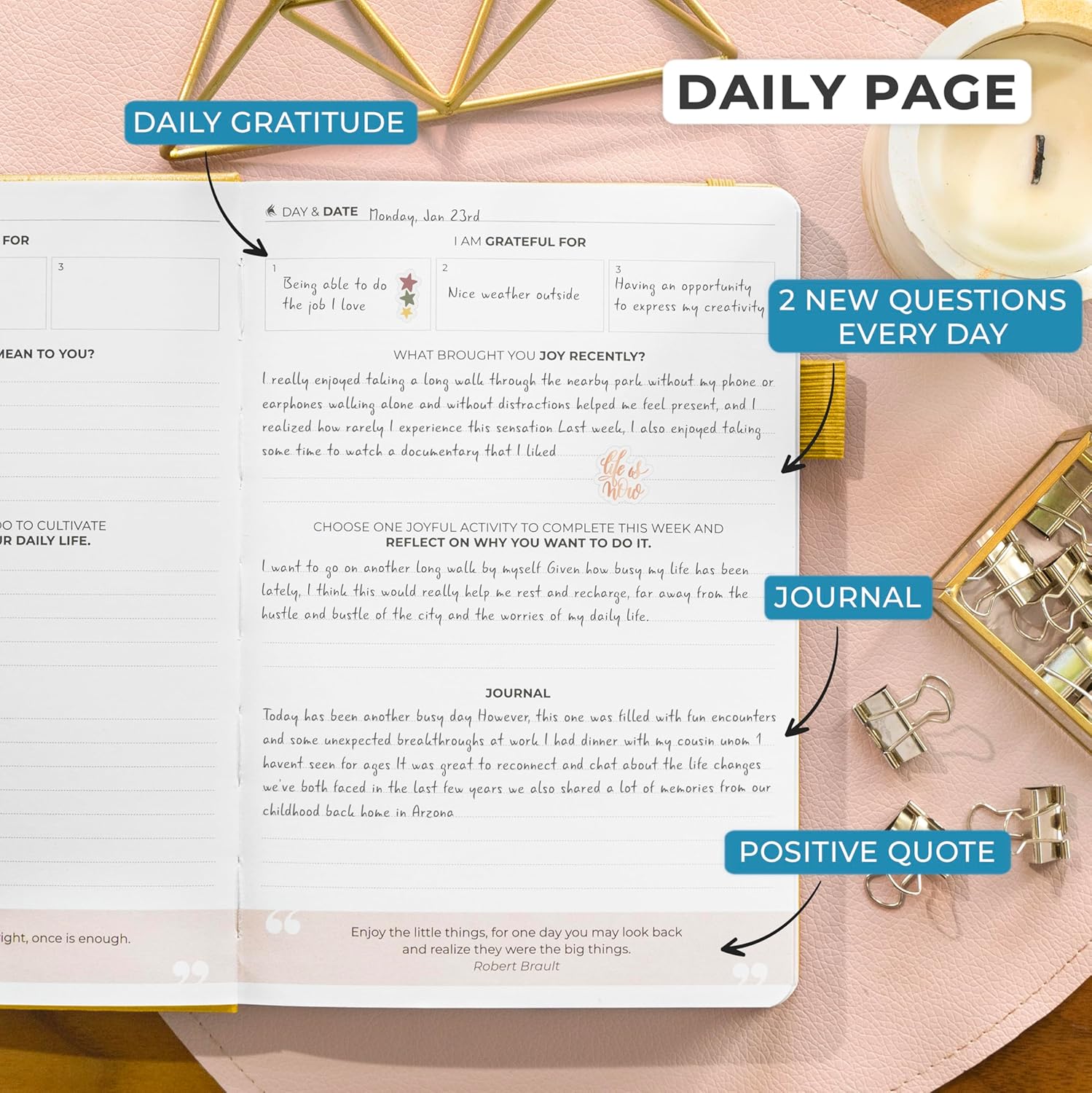 - PRACTICE DAILY GRATITUDE TO STAY POSITIVE – Begin each day by writing down three things you're grateful for in your daily positivity journal to recognize the good in your life and set a positive tone for the day ahead.