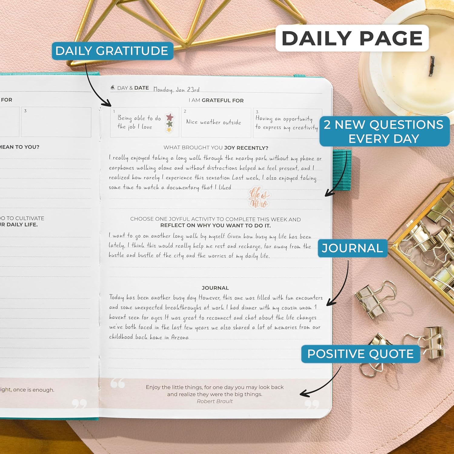 - DELVE DEEPER WITH NEW QUESTIONS DAILY – Each day, the positive journal offers a unique question and a reflection prompt to explore different areas of your life and find new, meaningful ways to cultivate happiness and reduce stress and negativity.