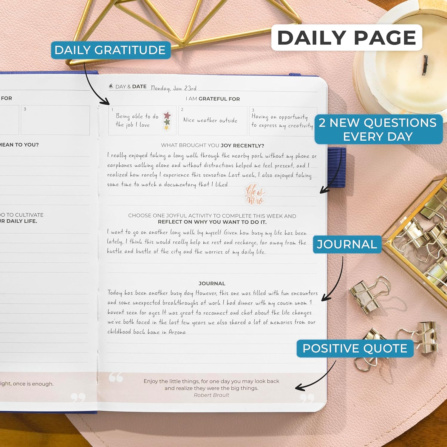 - PRACTICE DAILY GRATITUDE TO STAY POSITIVE – Begin each day by writing down three things you're grateful for in your daily positivity journal to recognize the good in your life and set a positive tone for the day ahead.