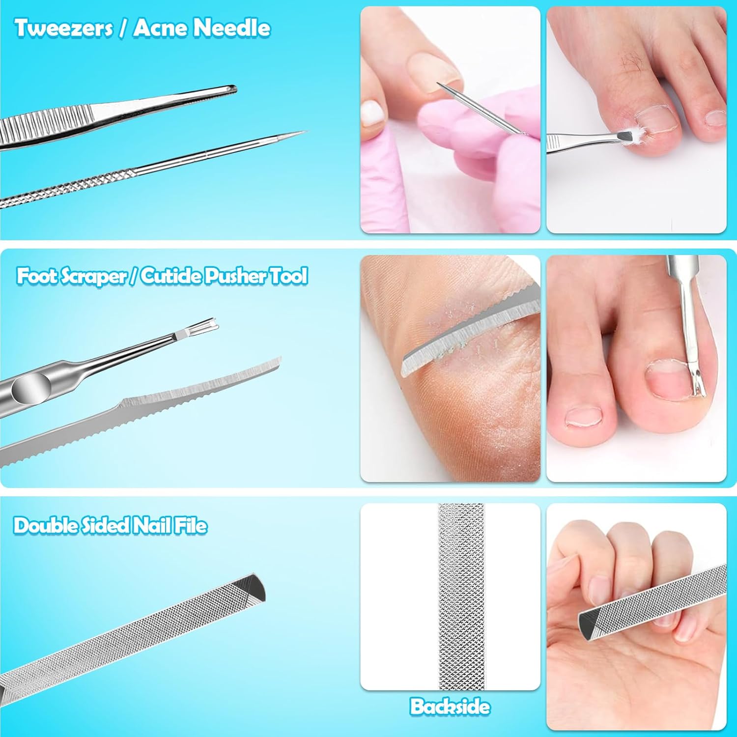 - 【11 in 1 Ingrown Toenail Tool Kit】 Includes 1*toenail clipper, 1*flat nose nail clipper, 1*nail lifter, 1*dead skin fork, 1*peeling knife, 1*nail pusher, 1*toenail corrector, 1*ingrown toenail corrector, 1* Tweezers, 1* Acne Needle, 1* Foot Scraper, 1* Cuticle Pusher Tool, 1* Nail Pusher, and a leather bag. Meet your various needs of toenail trimmers.