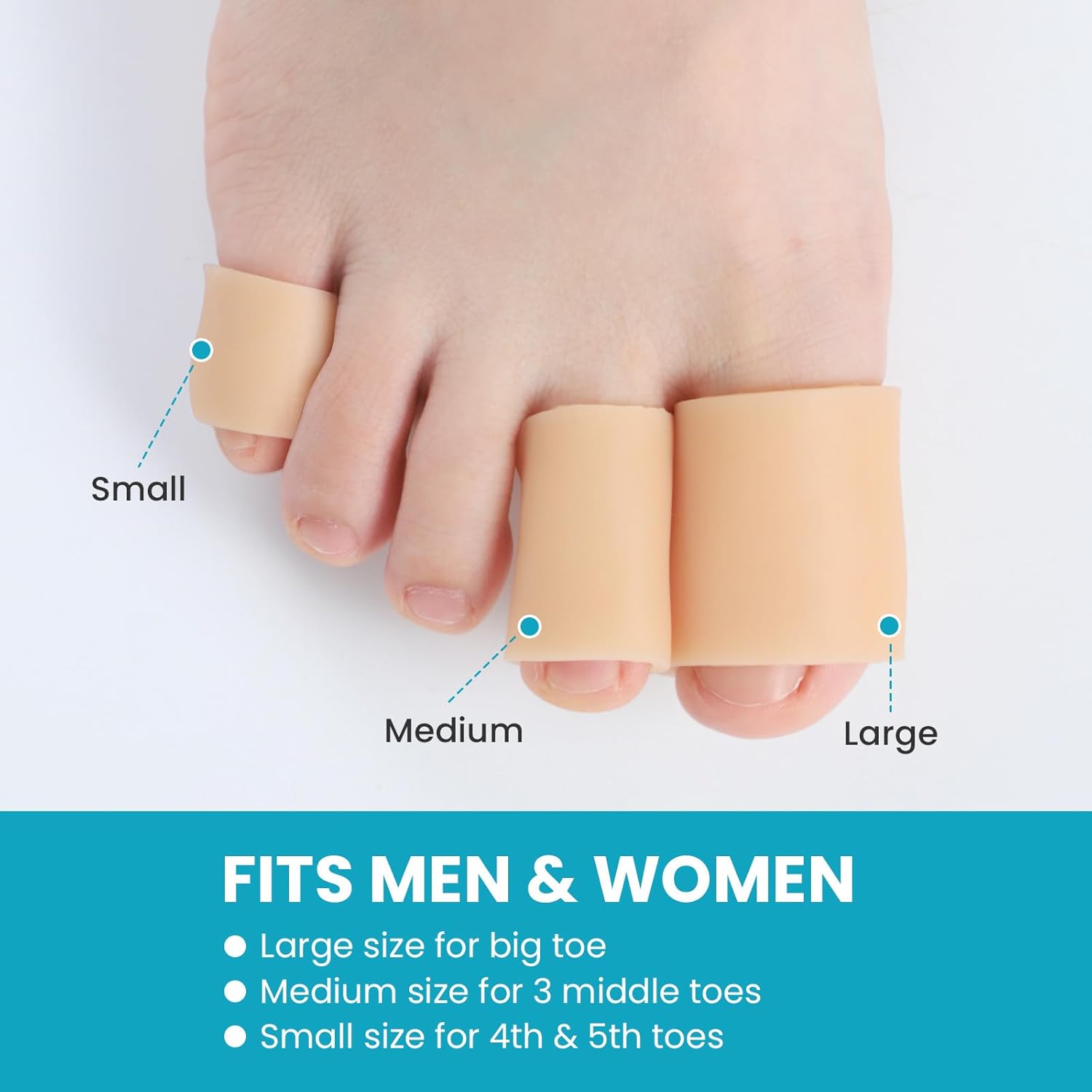 - Great Protection: Blister Cover is design for middle three toes or larger toe. Our gel toe protector set includes 4 pcs (large size) , 4 pcs (medium size) and 4 pcs (small size) that can be easily trimmed to fit perfectly on your all toes. Fit well in all styles of footwear.