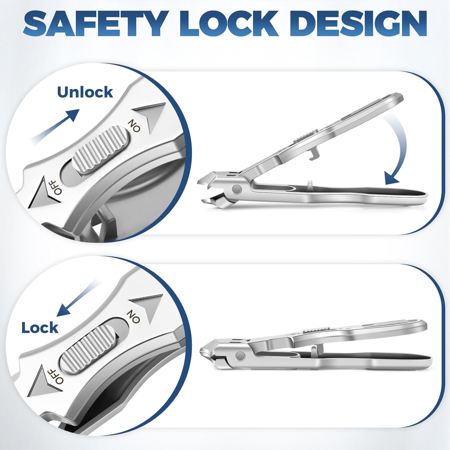 - 【Anti-splash & Safety Lock Design】The nail clipper with catcher design to prevent nails from splashing everywhere in process of nails clipping, keep your house clean after cutting nails; The finger nail clippers adult is wide jaw opening and extremely sharp, so built with a safety lock, push the slide lock into the safe position when you do not use it, and supply a case for carry