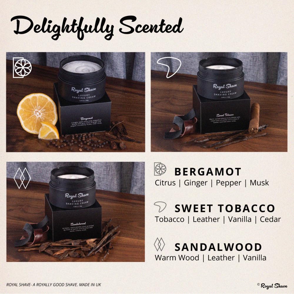- SANDALWOOD: Our distinguished shaving cream is imbued with the timeless essence of Sandalwood, exuding a rich, warm, woodsy aroma. Elegant leather undertones add depth, while a creamy finish completes the fragrance with indulgent elegance.