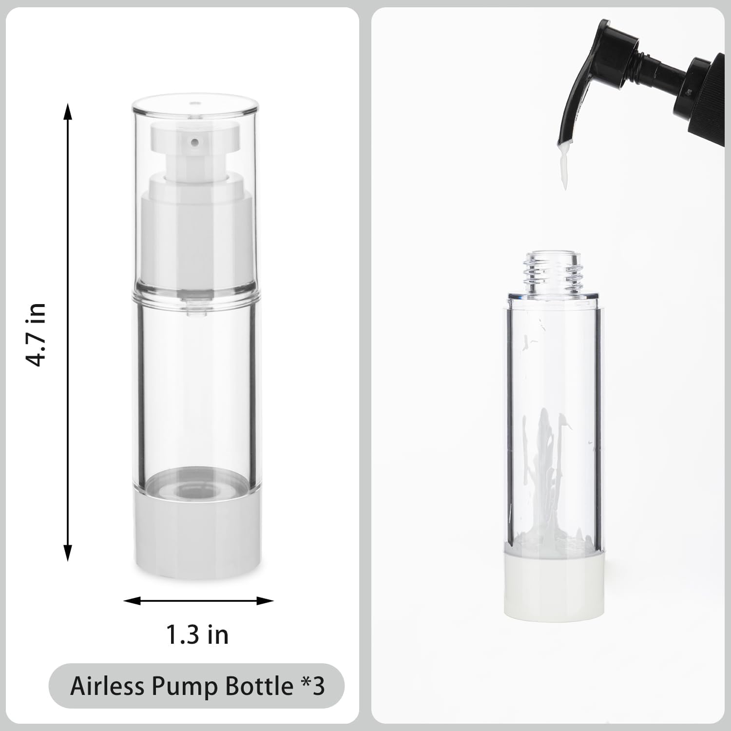 - 【Airless Vacuum Design】Our airless pump bottles feature an innovative airless vacuum and without-straw design, the use of atmospheric pressure to push the piston at the bottom of the bottle forward to extrude the emulsion, preventing your liquids from losing potency and freshness due to air contact oxidation.You can use it completely until there is nothing left.