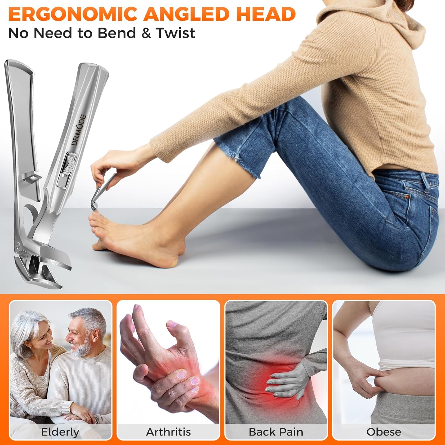 - NO NEED TO BEND & MORE COMFORTABLE - New angled head nail clippers are ergonomically designed, providing a clearer view of the blade and nail for accurate and confident nail cutting.With this nail cutter, there's no need for awkward twisted postures when cutting your toenails. Nail clippers with catcher is suitable for the elderly, pregnant women or men, etc