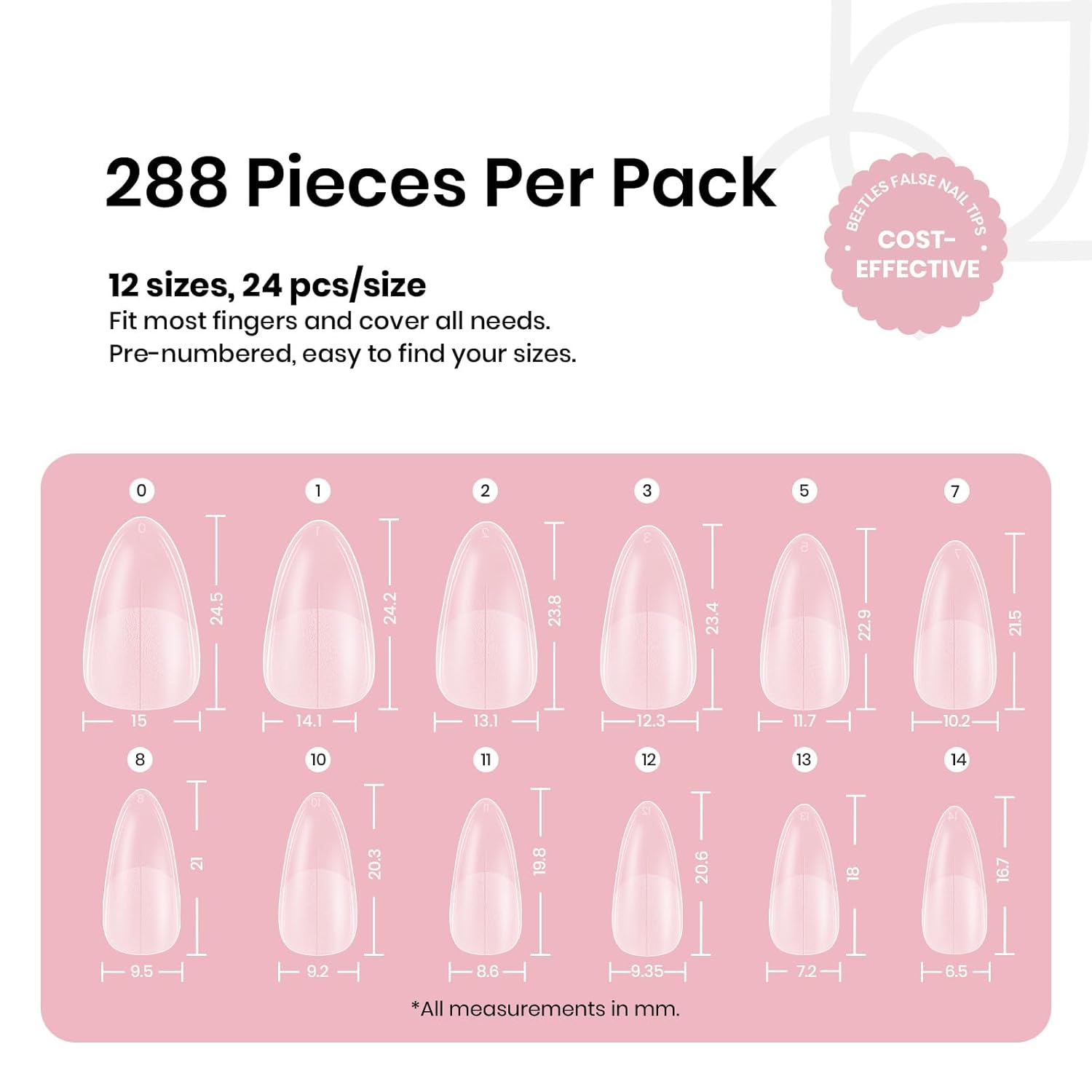 - Multiple sizes are available: This set contains 288 medium almond press-on nail stickers in 12 sizes (0/1/2/3/5/7/8/10/11/12/13/14), suitable for most finger shapes. Clear size numbers are marked on the top of the nail tip. The number can be covered when the nail tip is pasted and the base glue is applied. No additional processing is required, making the nail tip more natural, saving time for polishing it, and improving efficiency!