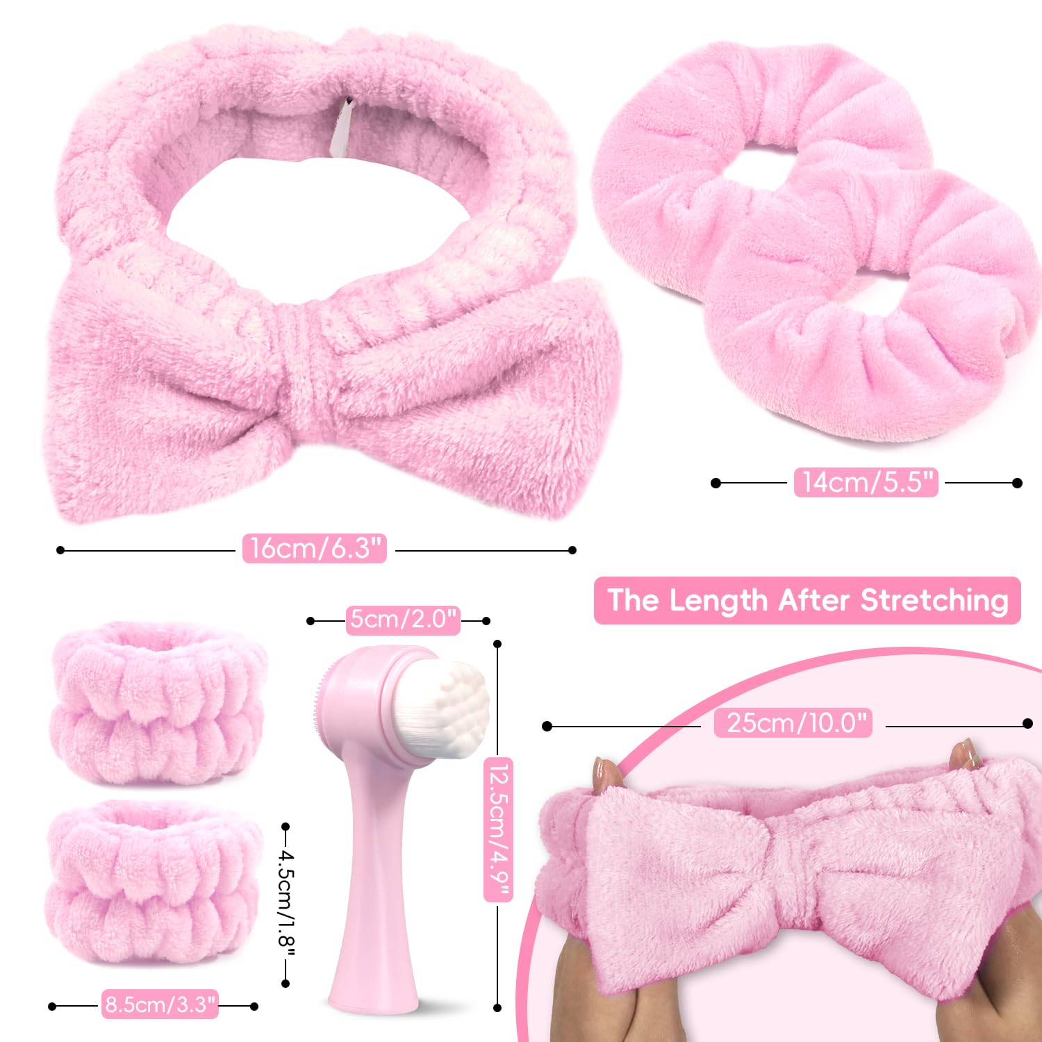 - 【What You Will Get】This high quality Face Brush Set includes a cute headband, 2 hair scrunchies, a face wash brush and 2 wrist face-washing bands. The Face Brush is designed with an ergonomic handle that perfectly fits your hands for added stability and provides a firm grip even when your hands are wet. This spa headband set is easy to wear, does not slip off, fits most people's heads, and can withstand frequent daily use without deformation. They are gentle on the scalp and do not cause discomfort even when worn for long periods of time.