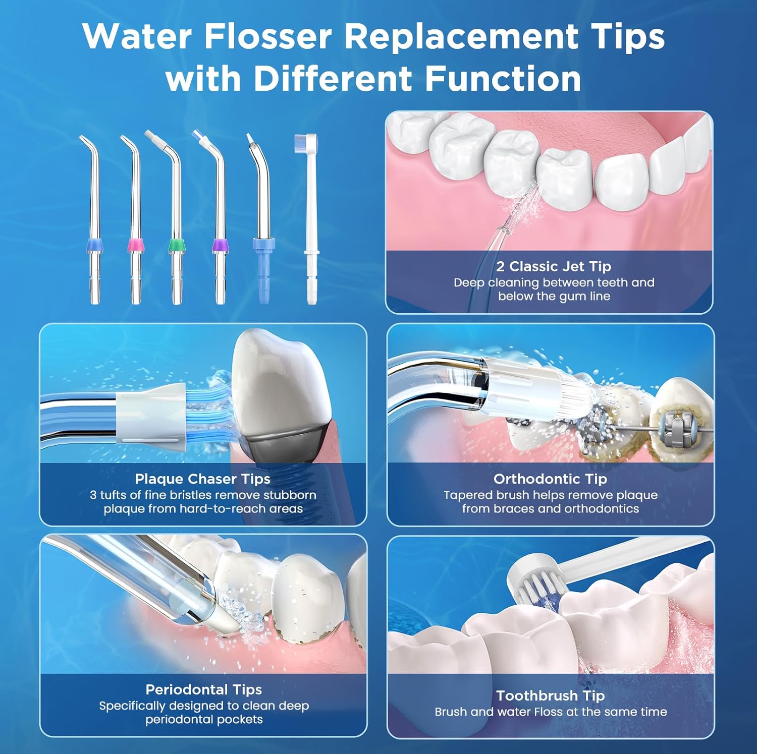 - Replacement Heads for Waterpik: The set comes with 6pcs various color coded replacement accessories for Waterpik, includes 2x Classic Jet Tips, 1x Plaque Chaser Tip, 1x Periodontal Tip, 1x Toothbrush Tip and 1x Orthodontic Tip, which meet your different cleaning needs.