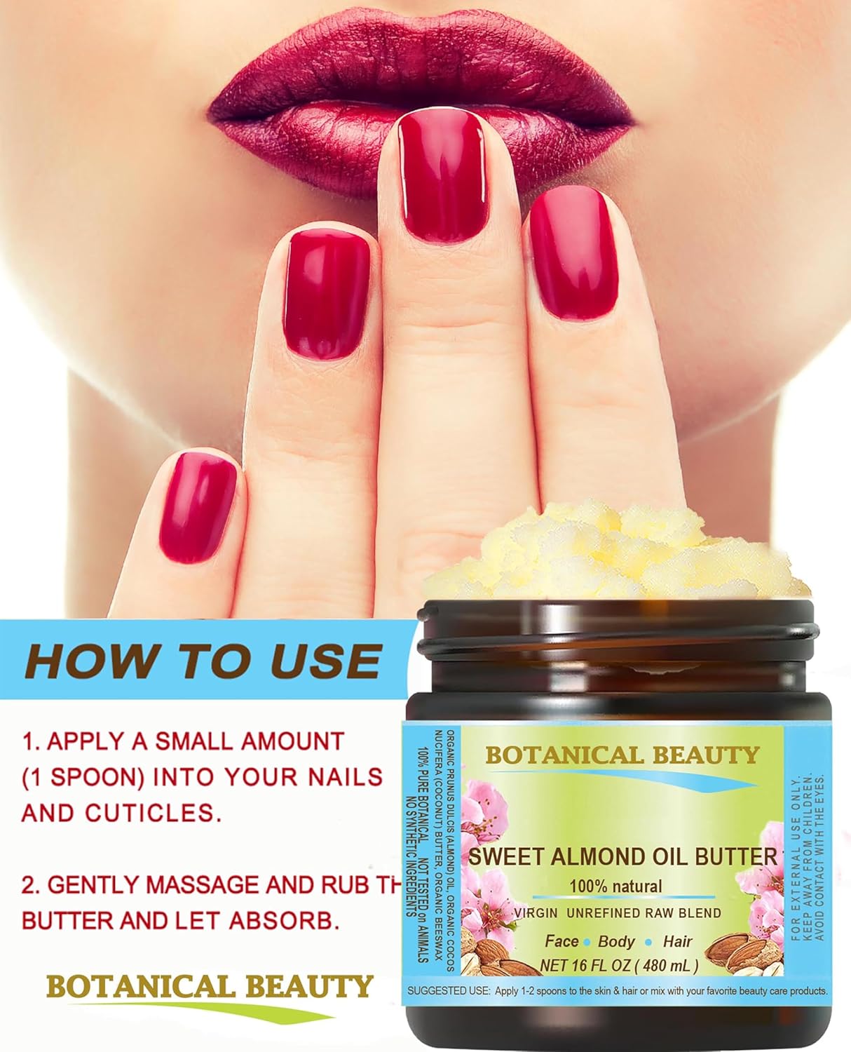 Botanical Beauty SWEET ALMOND OIL BUTTER Pure Natural Virgin Unrefined RAW for FACE, SKIN, BODY, DAMAGED HAIR, NAILS. (16 Fl Oz)