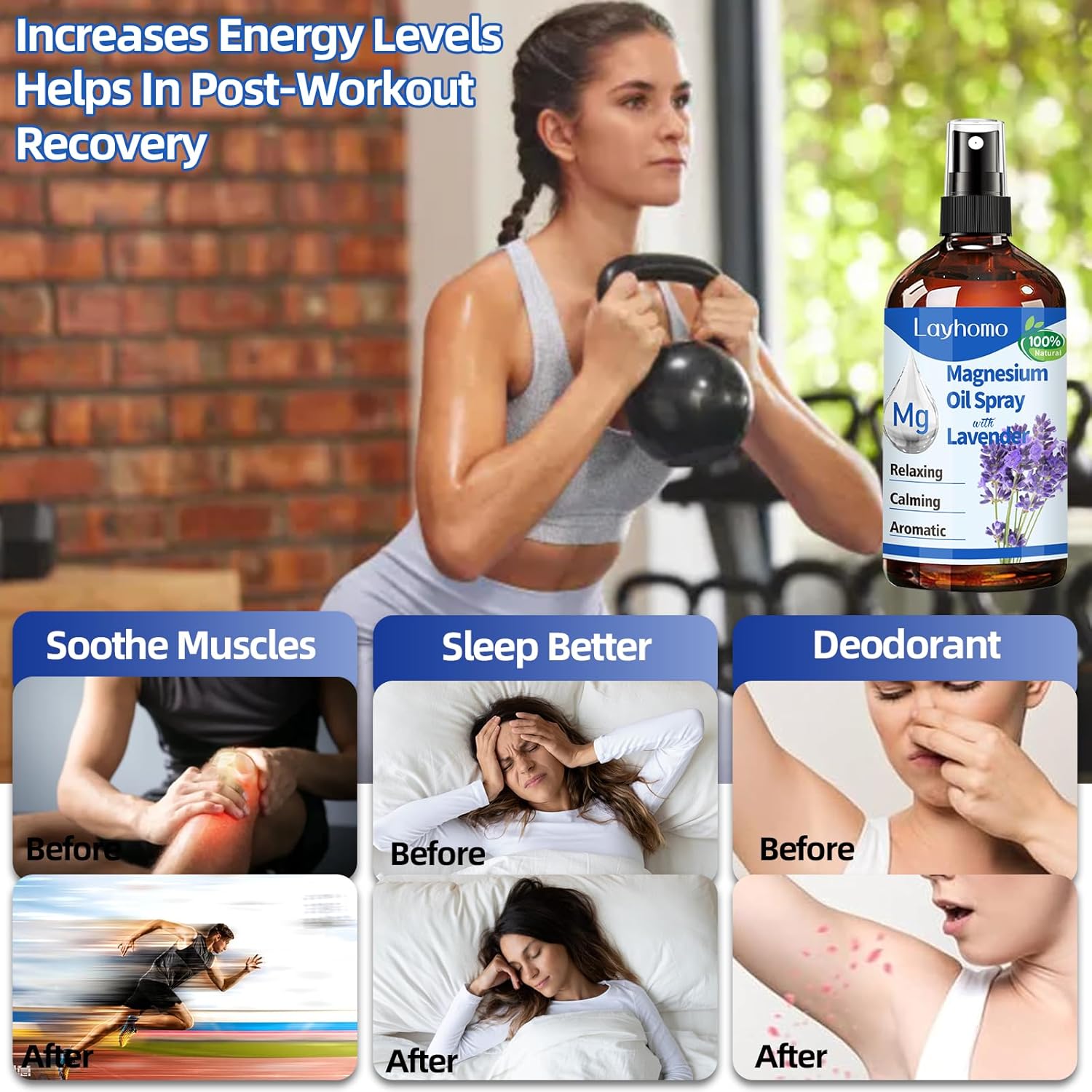 - Many Benifits-sooth sore muscles, improve sleep quility and Rejuvenate:We've enriched our magnesium oil spray with lavender, known for its calming properties to promote relaxation and improve sleep quality. It's scientifically formulated to absorb into the bloodstream within minutes, soothing sore muscles,rejuvenate,get relief. It's perfect for post-workout recovery or unwinding after a long day. Plus, it doubles as a natural refresher, making it an excellent choice for both deodorant and foot spray.