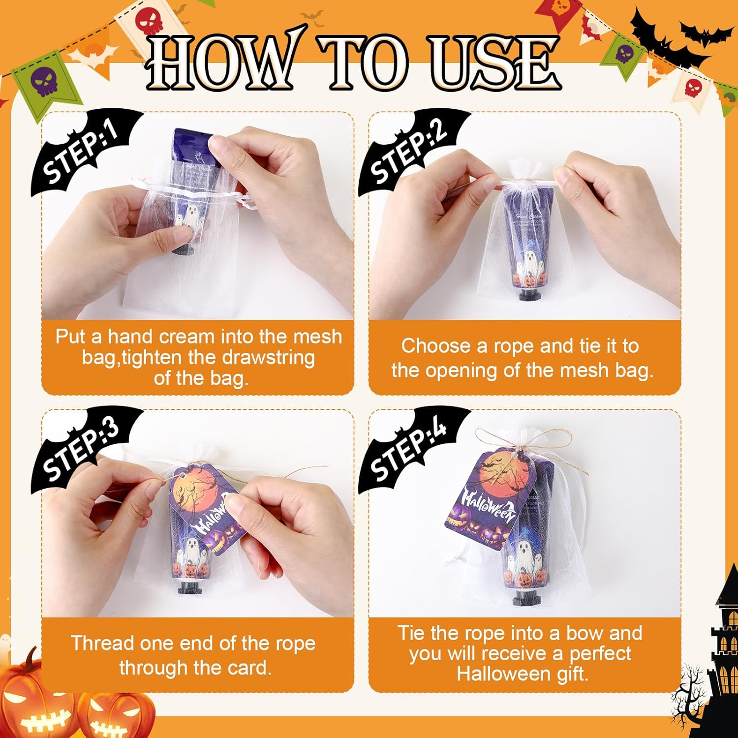 - 【50Pack Halloween Hand Cream Gifts】This Halloween gifts set includes 50pcs hand creams,50pcs organza gift bags,50pcs Halloween cards and 1pcs DIY manual.sufficient quantity and perfect combination to meet the needs of the Halloween party,increased the atmosphere and mystery of the Halloween party