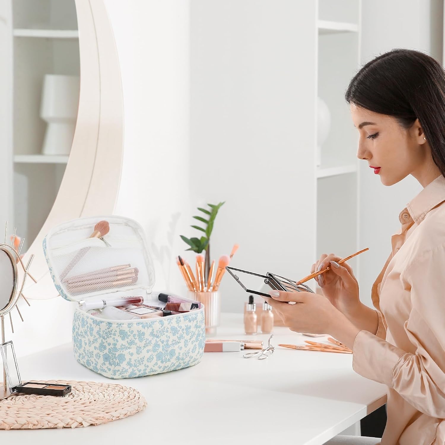 Prite Large Makeup Bag Cute Cosmetic Bag for Women Floral Coquette Aesthetic Toiletry Bag Travel Make Up Organizer Bag(Blue Flower)