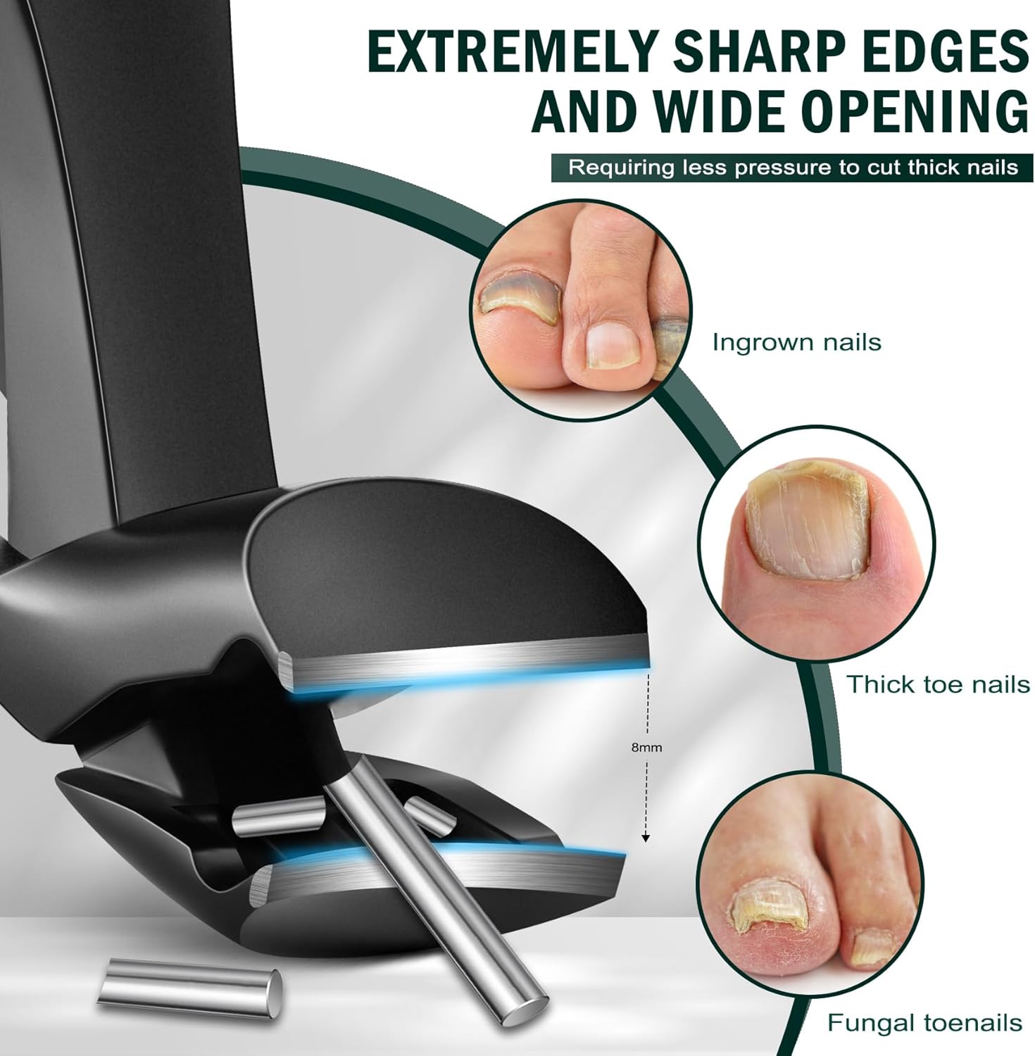 - 🎁Clean Nails, Clean Space - Flying clippings everywhere? Not anymore! Our anti-splash thick nail clipper is not only designed to give you a perfect cut every time but also to keep your workspace clean and tidy. With its unique design, this nail trimmer catches nail clippings and makes your nail care routine less messy.