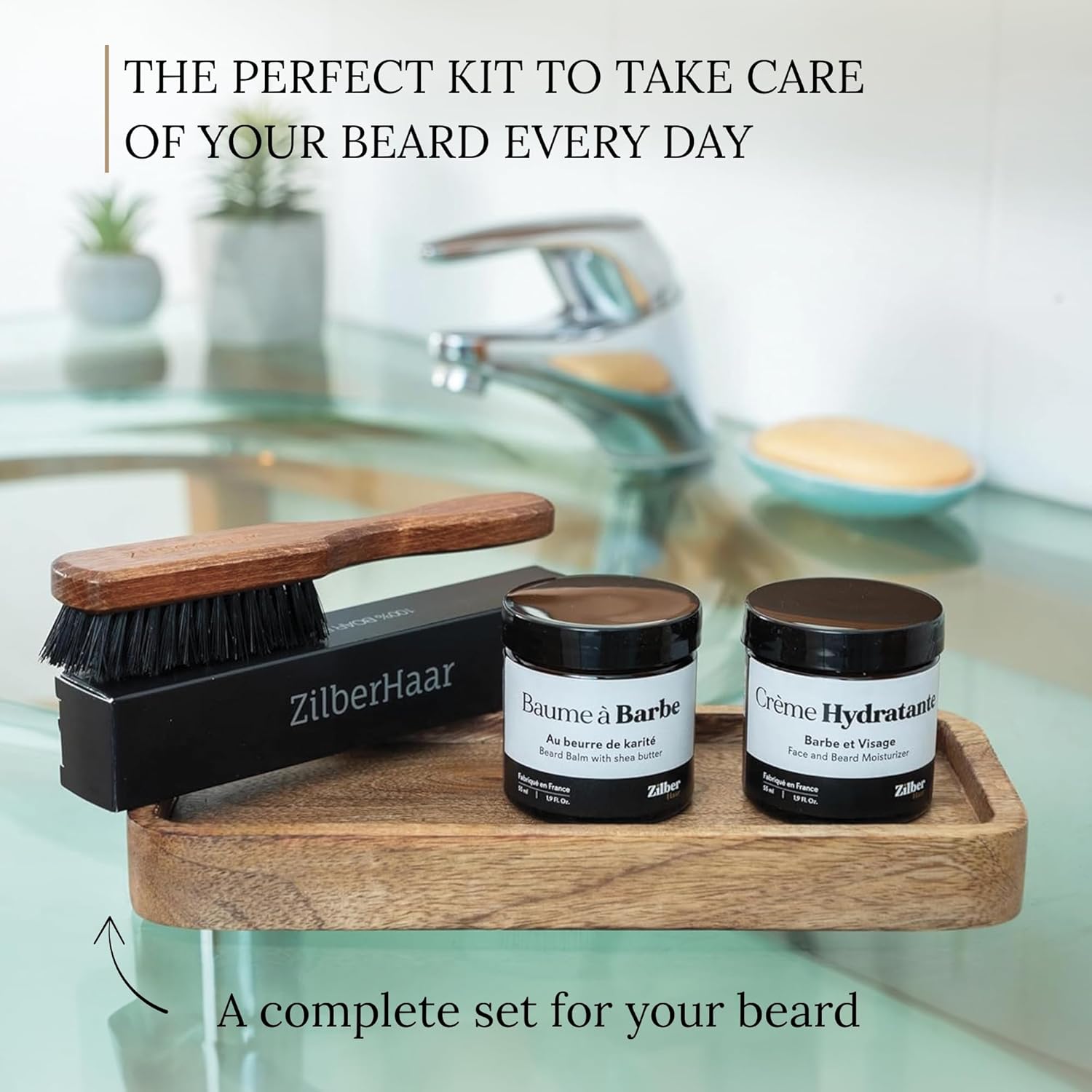 ZilberHaar - Beard Care Kit for Men - 1 Regular Beard Brush + 1 Beard Balm + 1 Moisturizing Cream - Stiff Boar Bristles and Beech Wood - Short to Medium Length Beards - Supplied in a Velvet Bag