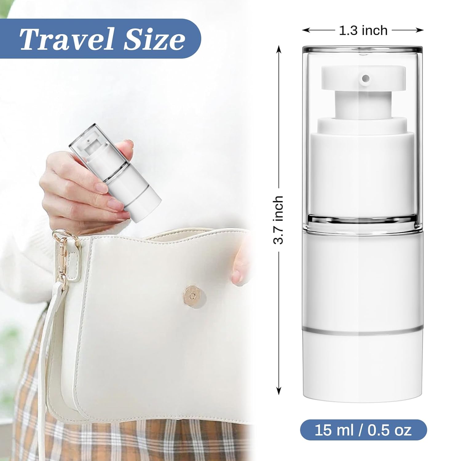 - Value Pack: You will get 6pcs 15 ml/0.5 oz airless pump bottles with lids, each measures approx. 1.3" Ξ¦ x 3.7" H (33 mm x 95 mm), suitable for storing various types of cosmetics