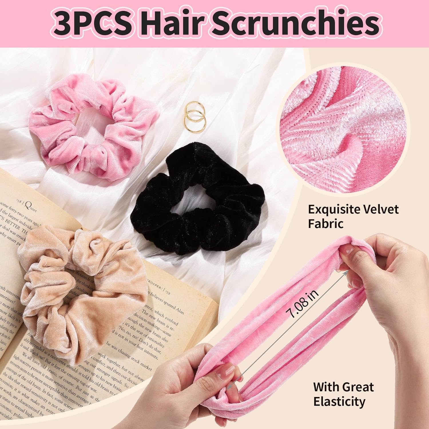 - Makeup Headbands & Hair Scrunchies Set: Includes 3pcs spa headbands and 3pcs hair scrunchies, come in three colors-Pink & Black & Creamy White, help hold all your hair up when washing face, brushing teeth, wearing makeup, doing skincare etc.. perfect gift for women and girl.