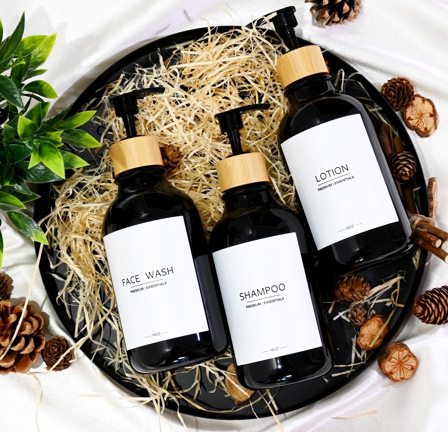 Shower Shampoo and Conditioner Bottles, Apothecary Dispenser Bamboo Pump, Refillable Bottles for Lotion Oil Hand Soap and Dish Soap, Plastic Set (3 Bottles 9 Labels) (6, Black)