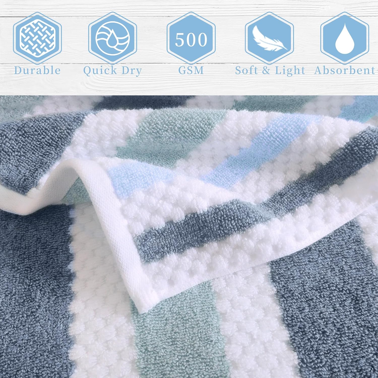 - 【Coastal Decor】Soft baby blue, slate gray, and seafoam stripes meet crisp white waffle-textured sections, evoking ocean breezes and sunlit shores. The raised waffle weave adds tactile depth and quick-drying practicality, while the color palette infuses serene nautical charm. Perfect for creating a spa-like oasis or adding decorator flair, these towels merge style and functionality—transforming routines into moments of seaside-inspired luxury.