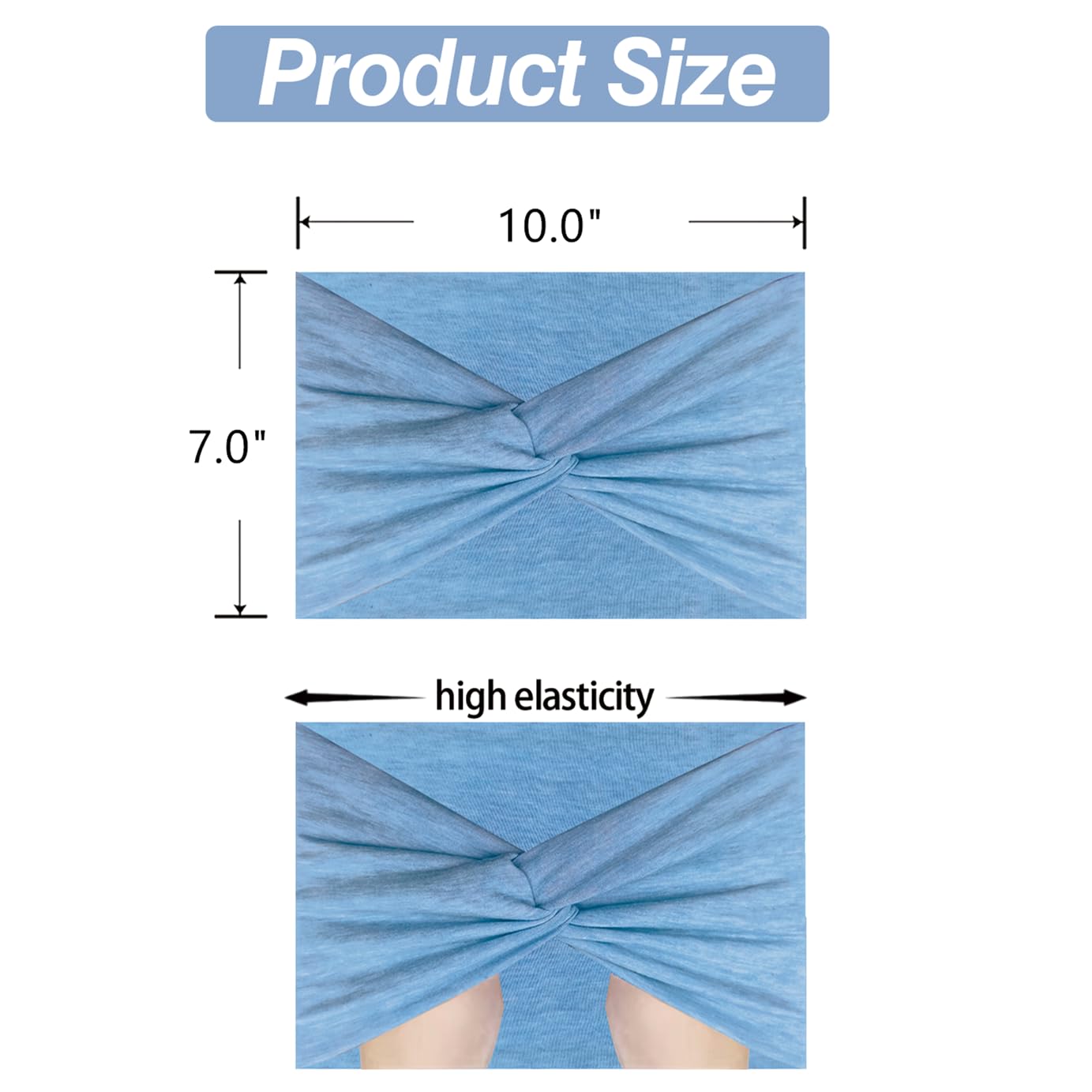 - Wide Headbands for Women ▶The headbands are cut as 7" width x 10" length (can be pull up to 17" with its high strech feature),which are larger than the normal ones and will make the bandana headbands non-slip,so that can be staied in place perfectly,suitable for almost of the heads' size of the adult women and teen girls.Total 6pcs different color headbands packed.