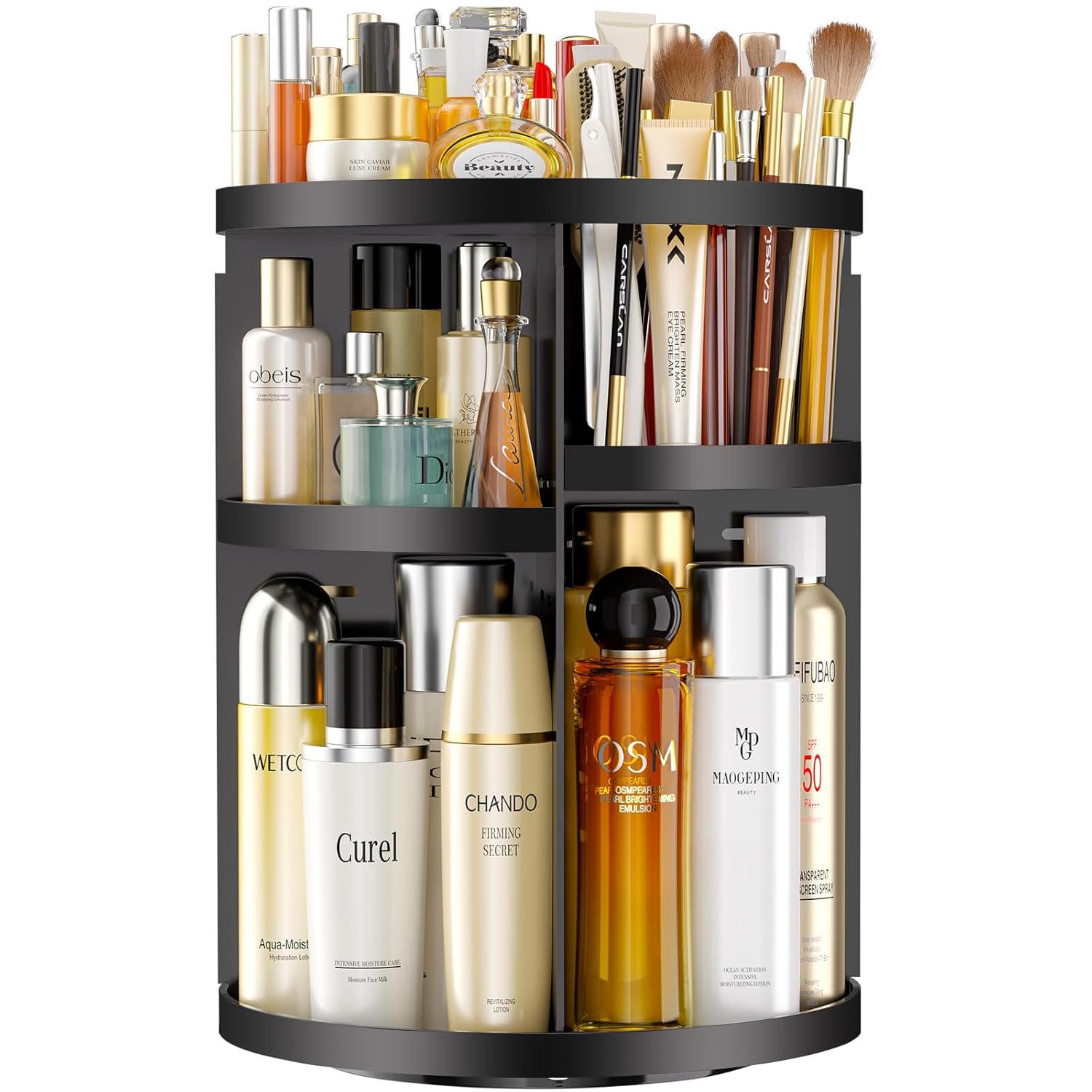 - ă7 ADJUSTABLE LAYERS & SAVE SPACEăâ¨360 rotating makeup organizer has four trays that you can adjust to easily store all your things. Ourmake up organizers can store at least 18 perfumes, 14 facial toners, 12 facial moisturizers, 8 makeup brushes, 6 powders, 5 makeup remover, etc. Save 70% of your desktop space.
