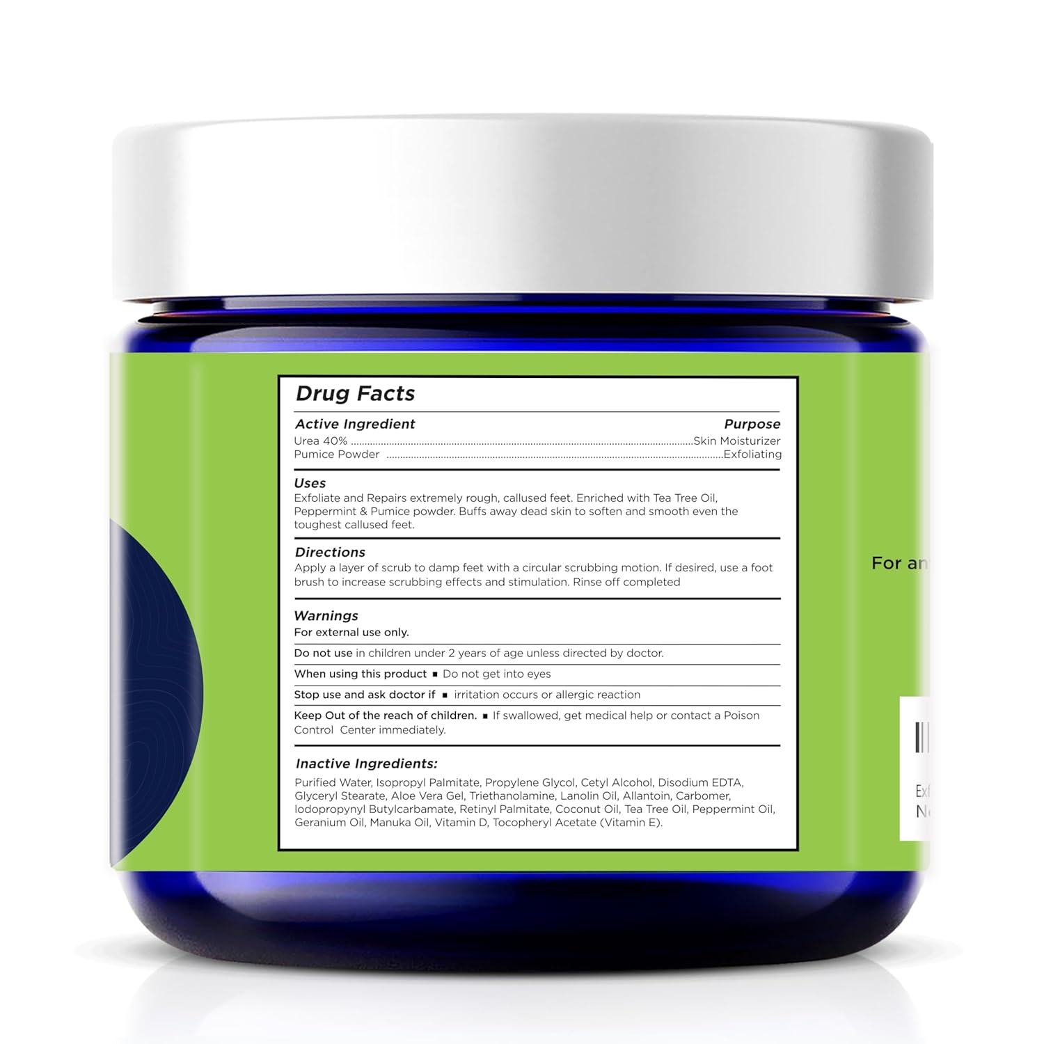- FOOT SCRUB FOR SMOOTH, SOFT FEET – This exfoliating and foaming foot scrub features granulated pumice to gently remove dry, rough skin. Infused with eucalyptus, tea tree, and lavender essential oils for a refreshing and nourishing spa-like experience. Comes in a convenient 2 oz jar