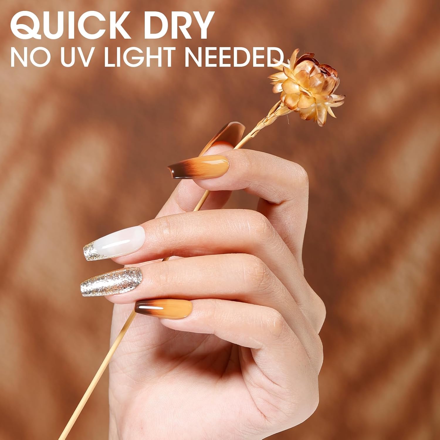- Winter Fall Brown Gel Nail Polish Set: We put the 6 most popular fall colors together, and refer to the natural colors of autumu, this is a stylish, modern manicure nail polish set on fall. It comes with the gold glitter, nude brown, yellow brown, red brown, dark brwon and glitter brown gel nail polish to DIY at home for winter fall