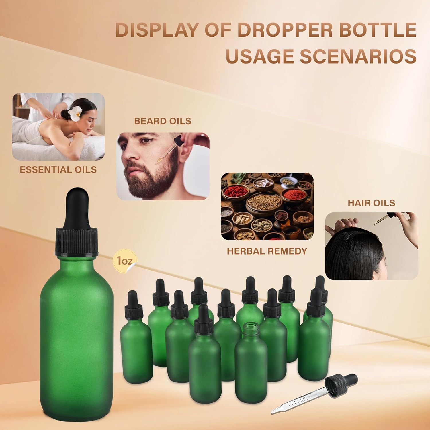 12 Pcs, 2oz Dropper Bottle, Green Glass Eye Dropper Bottle, Tincture Bottles with Dropper, Pretty Finish, Leak-Proof Design, Stronger Suction for All Kinds of Mixed Liquids