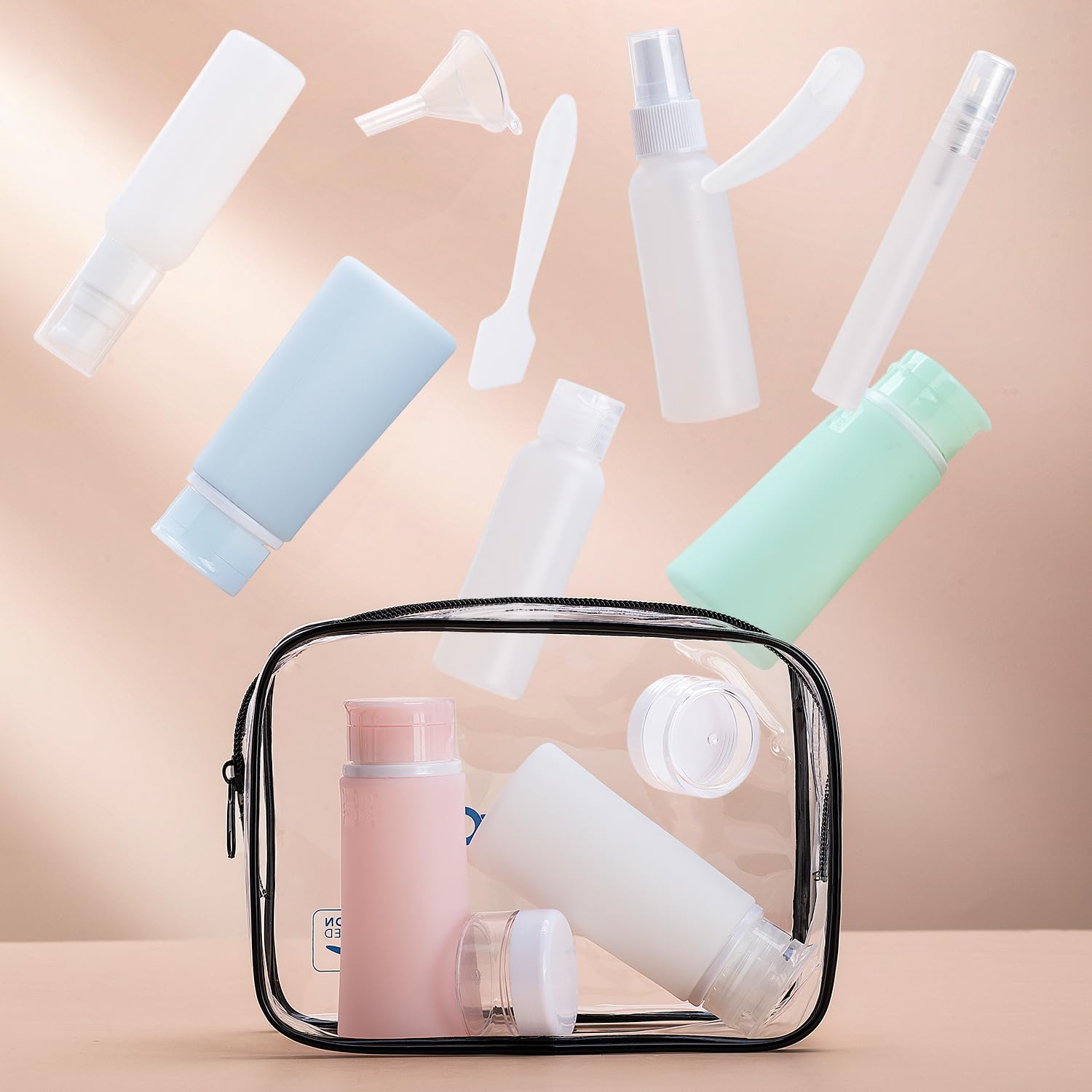 - 【Designed for Travel Accessories】Our 15 pack reusable travel bottles set with 1*waterproof bag, 4 *silicone bottles (3.4oz/100ml), 3* Empty Plastic Travel Bottles (1.7 oz/50ml),1* Perfume spray bottle(0.34oz/10ml), 1*cream jar(0.35oz/10ml), 1*cream jar(0.7oz/20ml),1*funnels,1*labels , 2*spatula! This travel bottles set allows you to travel with peace of mind!