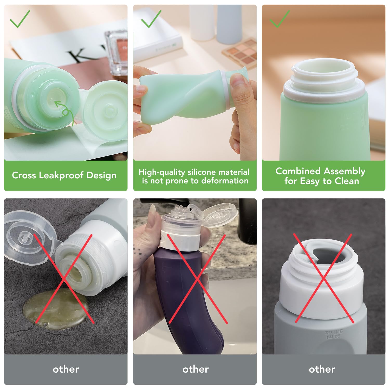 - 【Safety Material 】 Made of Food Grade BPA Free Silicone, this travel set is sturdy, soft, squeezable, flexible and reusable. Safe material guarantee that you can not only use them to store shampoo, conditioner, face soap, sunscreen, creams, lotion or etc.