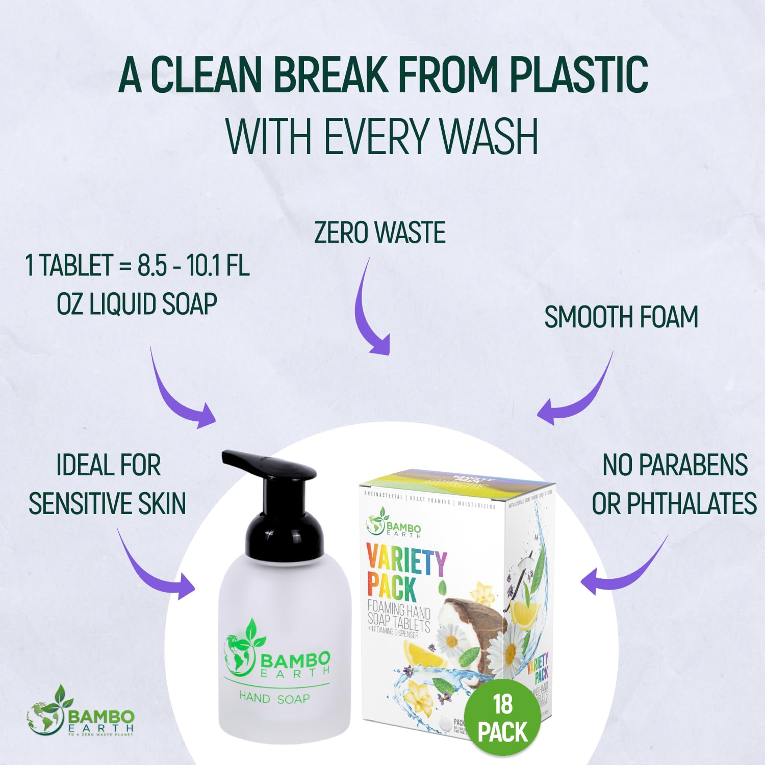18 Pack Natural Foaming Hand Soap Tablets - Soft Moisturizing Handwash Tab Refills - 1 Tablet = 9 Oz Refillable Liquid Wash Foam Handsoap - Eco-Friendly Paper Softsoap Refill Tabs (Dispenser + 6 Tabs)