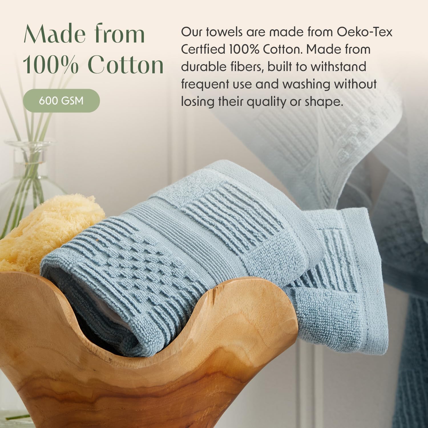 - QUALITY : Made of 100% High Quality Cotton for Ultimate Comfort and Durability. Our towels are 600 gsm with provides extra absorbency and the textured fabric dries quickly and completely.
