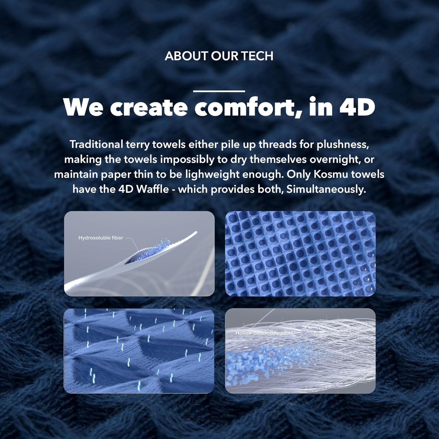 - Get bone dry every A.M.: While the waffle structure intrinsically maximizes surface exposure for airflow for guaranteed breathability, allowing the towel to dry itself out quickly, we have fundamentally improved the performance of Kosmu Towel with advanced science and technology.