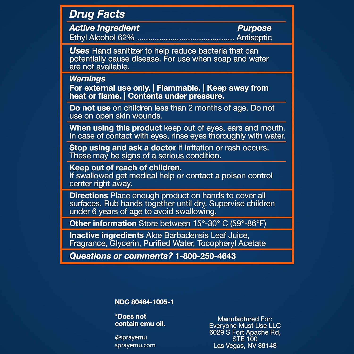 - 1. Superior Efficacy: EMU Hand Sanitizer Spray eliminates 99.9% of germs and bacteria, ensuring your hands are always clean. It provides reliable protection. TSA Approved / Non-Aerosol / 100% Recyclable