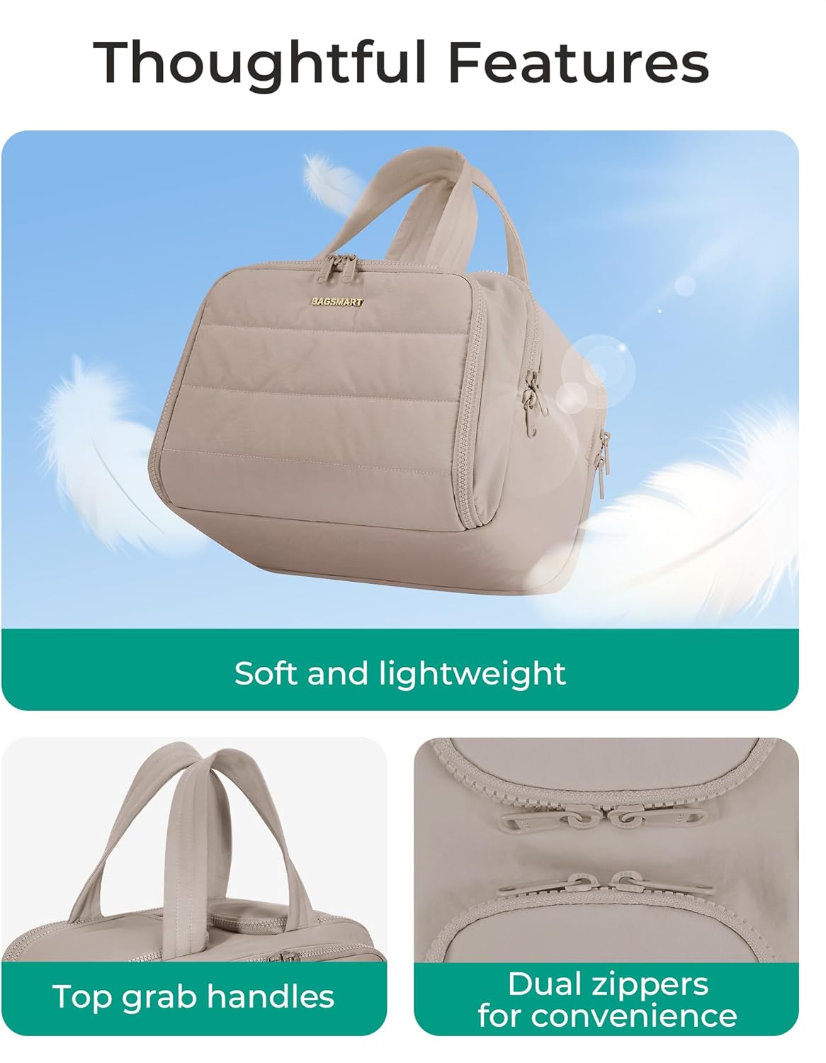 BAGSMART Travel Toiletry Bag, Lightweight Large Wide-open Travel Bag for Women, Puffy Cosmetic Makeup Bag Organizer with Handle for Accessories,Essentials, Toiletries, Grayish Brown