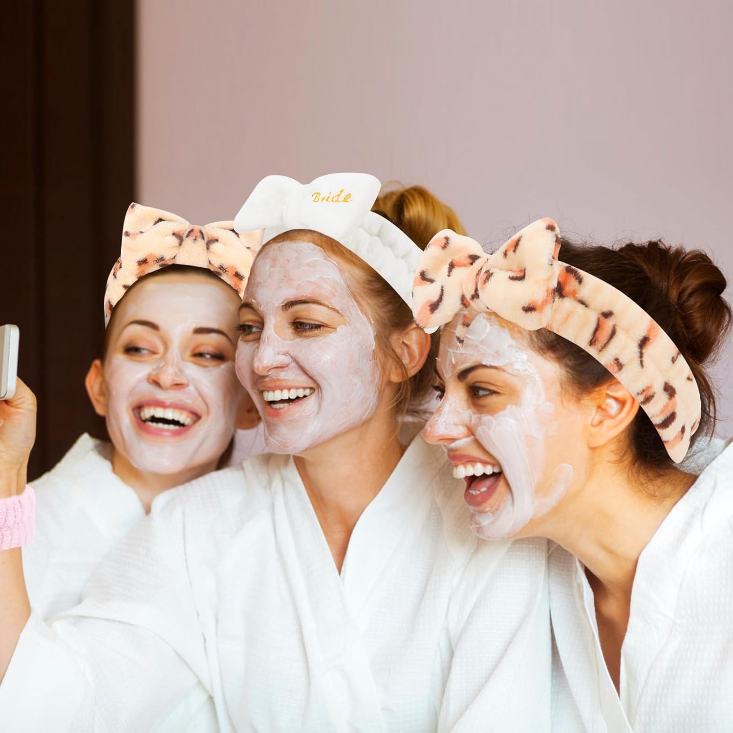 - The perfect bachelorette themed party favors: 1 white bridal spa headband +7 leopard print bridesmaid spa headbands.