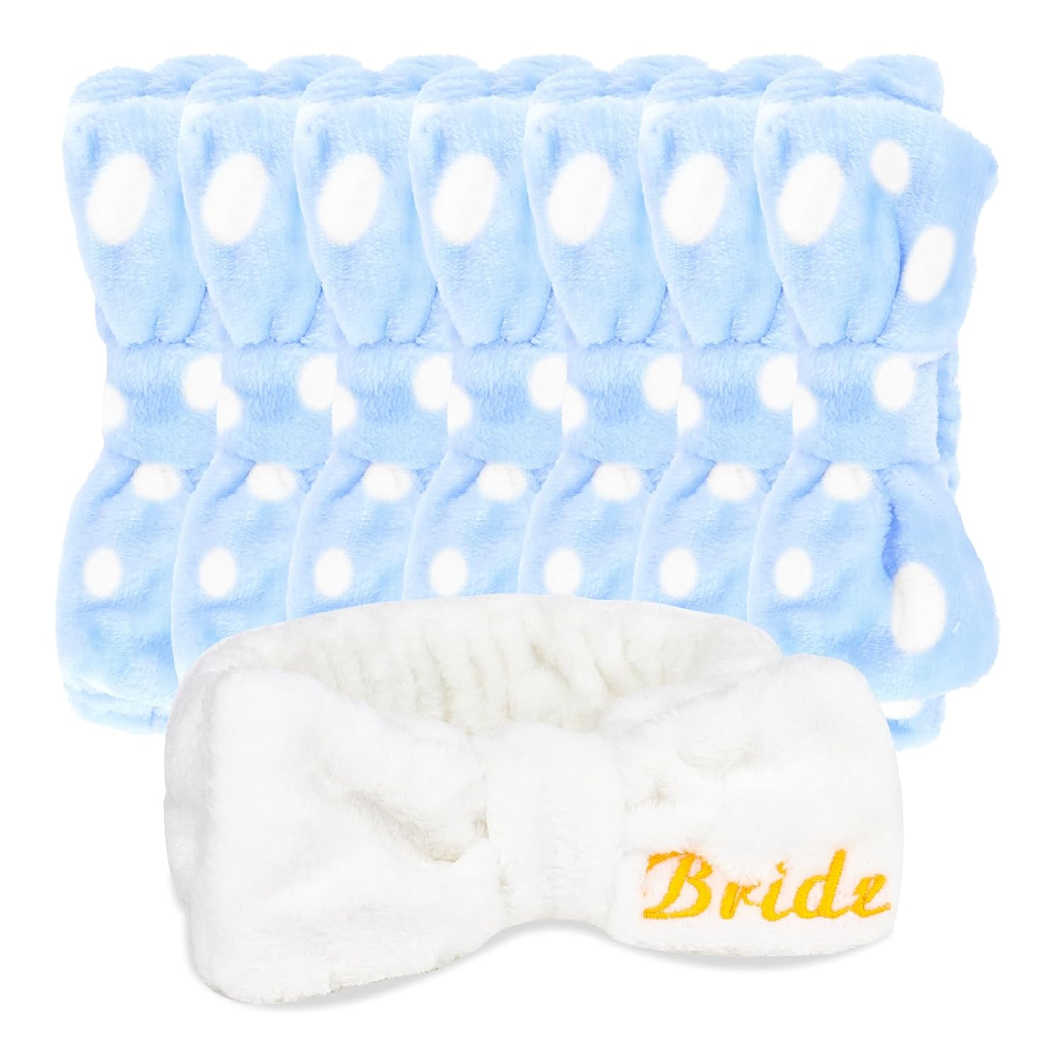 - The perfect bachelorette themed party favors: 1 white bridal spa headband +7 blue dot bridesmaid spa headbands.