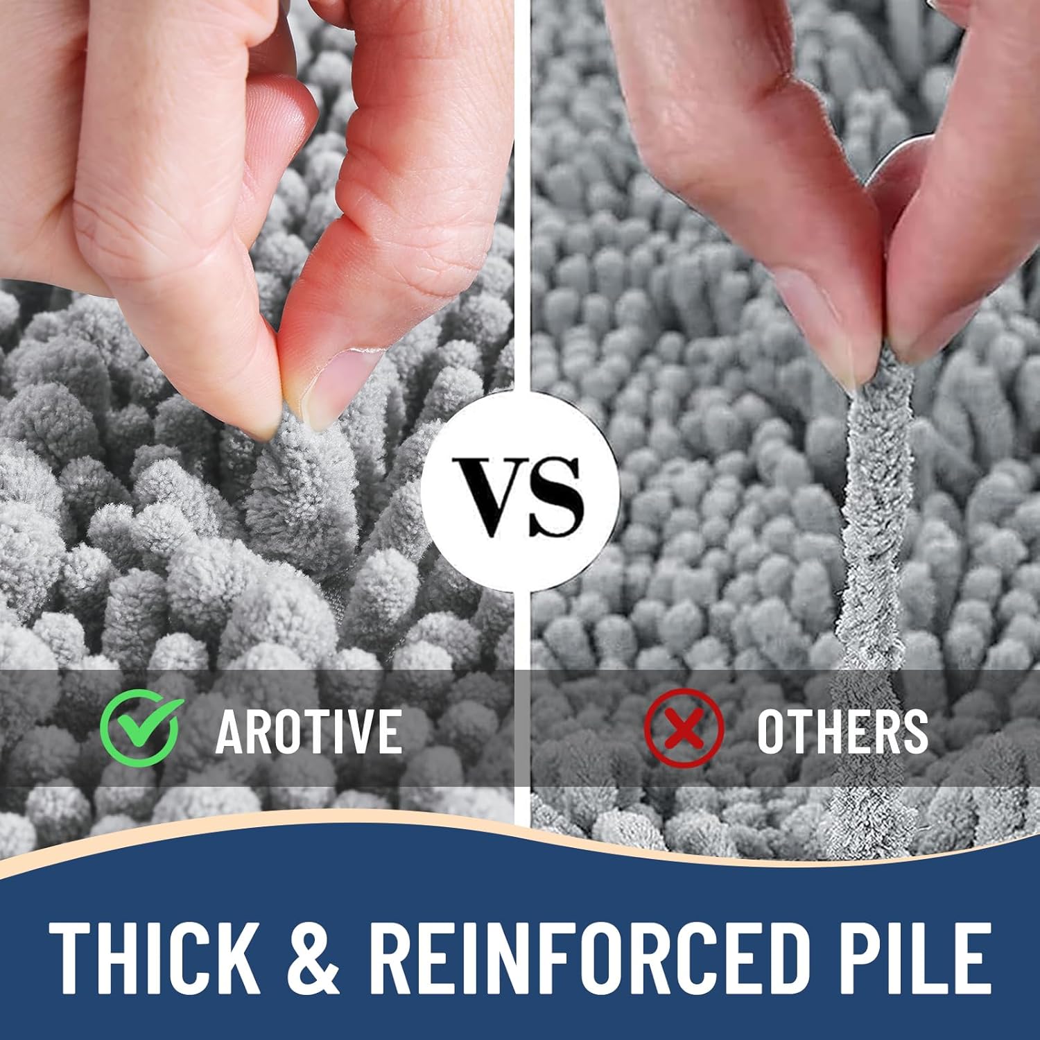 - Anti-Skid Backing: Arotive chenille bathroom rugs feature a non-slip bottom consisting of sturdy mesh PVC material that stops the bath mat from shifting and skidding. The middle layer is 4 mm memory foam, which can let you feel more comfortable when wrapping into the rugs. WARNING: Place bath mat on CLEAN DRY FLAT FLOOR ONLY. Water under bath rug can cause it to slip. Always keep the bottom of bath rug dry