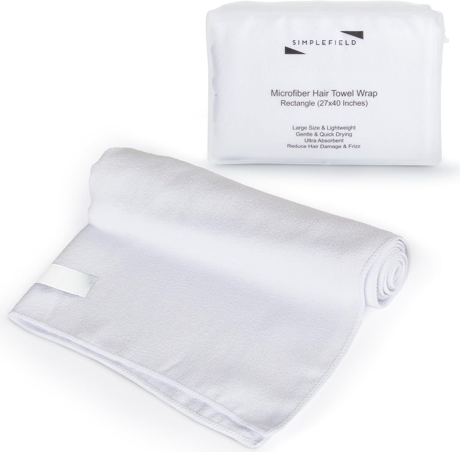 Large Microfiber Hair Towel Wrap for Women (27x40 Inches). Anti Frizz Rectangle Drying Towel with Elastic Band for Long, Curly, and Thick Hair. Includes Reusable Carry Bag (Bright White)