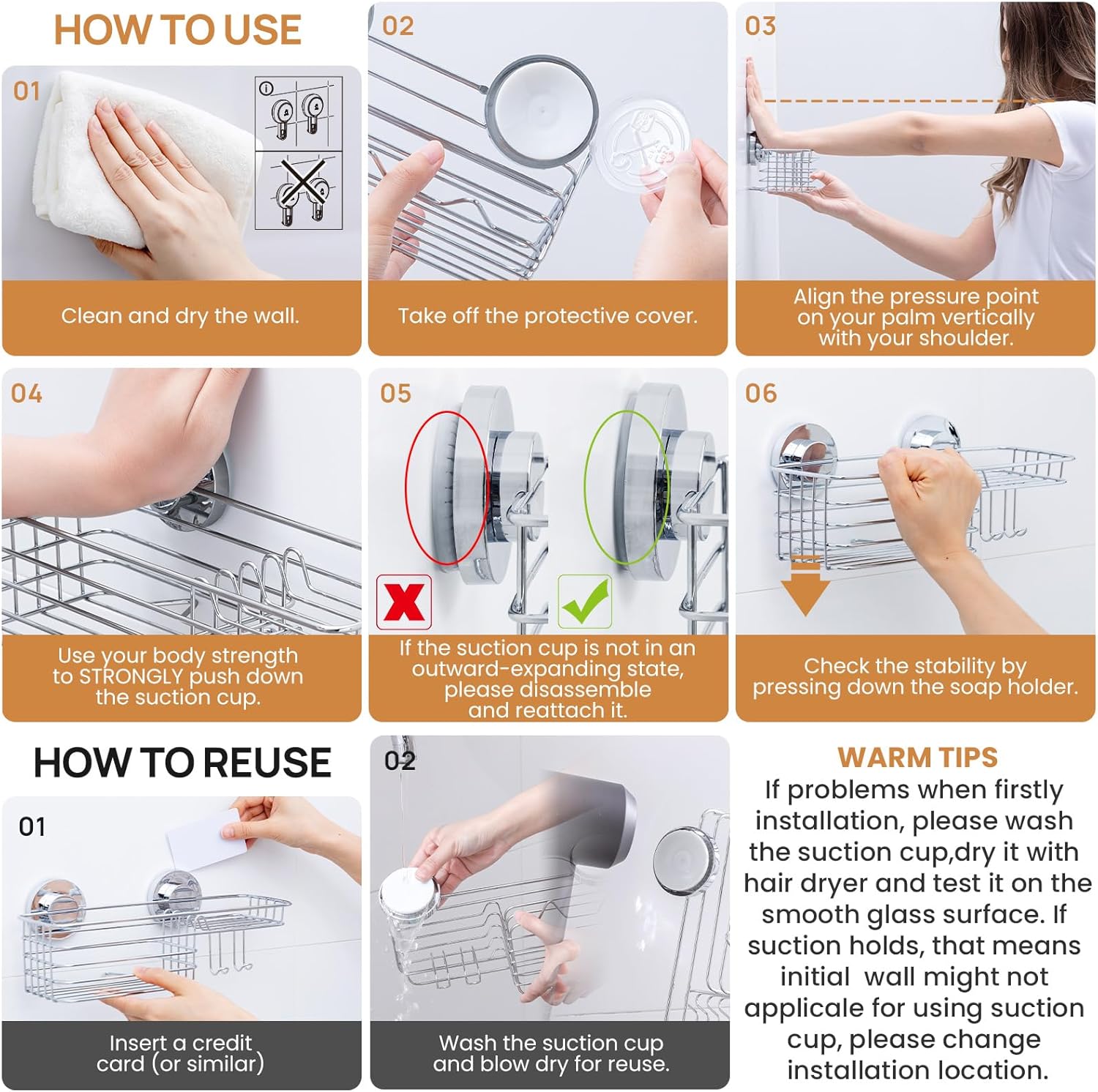 - Warm Tip: This shower organizer works best for non-porous, impervious, smooth surfaces such as glass, mirror, polished metal, stainless steel, plastic board, wall tile, grainy granite, etc. Please remind that don't stick to a grout line. If problems when firstly installation, please wash the suction cup, dry it with hair dryer and test it on the smooth glass surface. If suction holds, that means initial wall might not applicable for using suction cup, please change installation location.