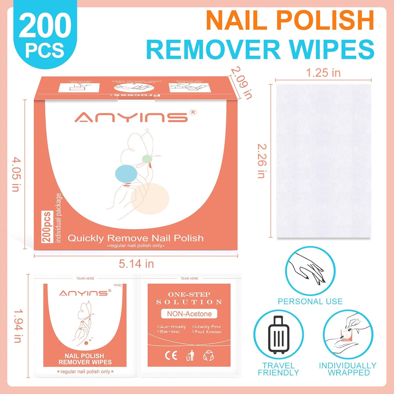 - ACETONE-FREE MILD FORMULA: ANYINS nail polish remover pads, use non-toxic ingredients, have a low odor, are gentle on nails and cuticles, and 200PCS provides a soft and effective removal experience. In addition, nail removal WIPES contain nutritious oils that nourish and moisturize nails and cuticles