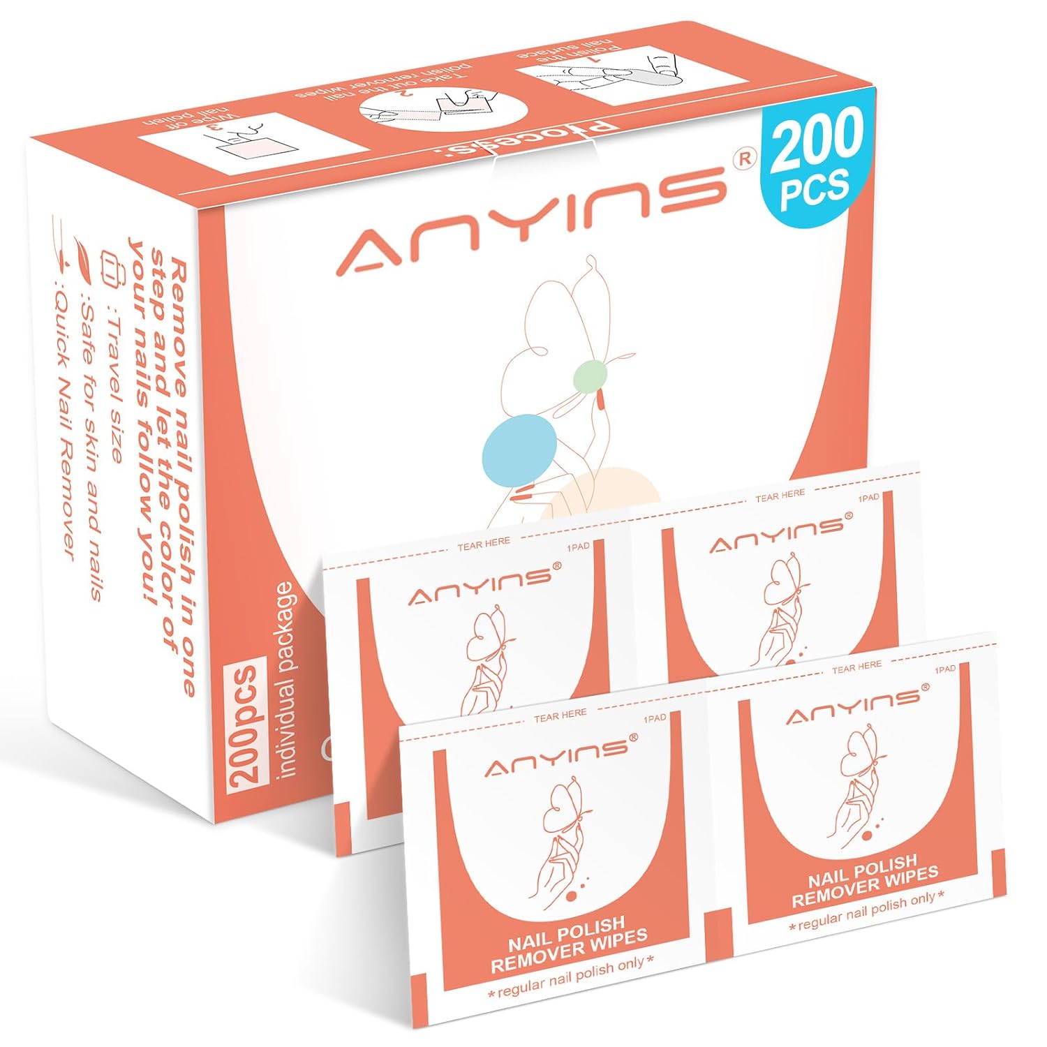 - QUICK AND EFFECTIVE REMOVAL: The ANYINS nail polish remover wipes are individually packaged and fully soaked with nail polish remover, making them easy to use. Simply peel and wrap your nail, seal it, let it dissolve the nail polish, and after about 15 minutes, remove the nail polish with ease, no complicated tools or procedures are required. You can water the flowers, read a book, and use your phone while removing your nail polish, saving you time and being very friendly to newbies