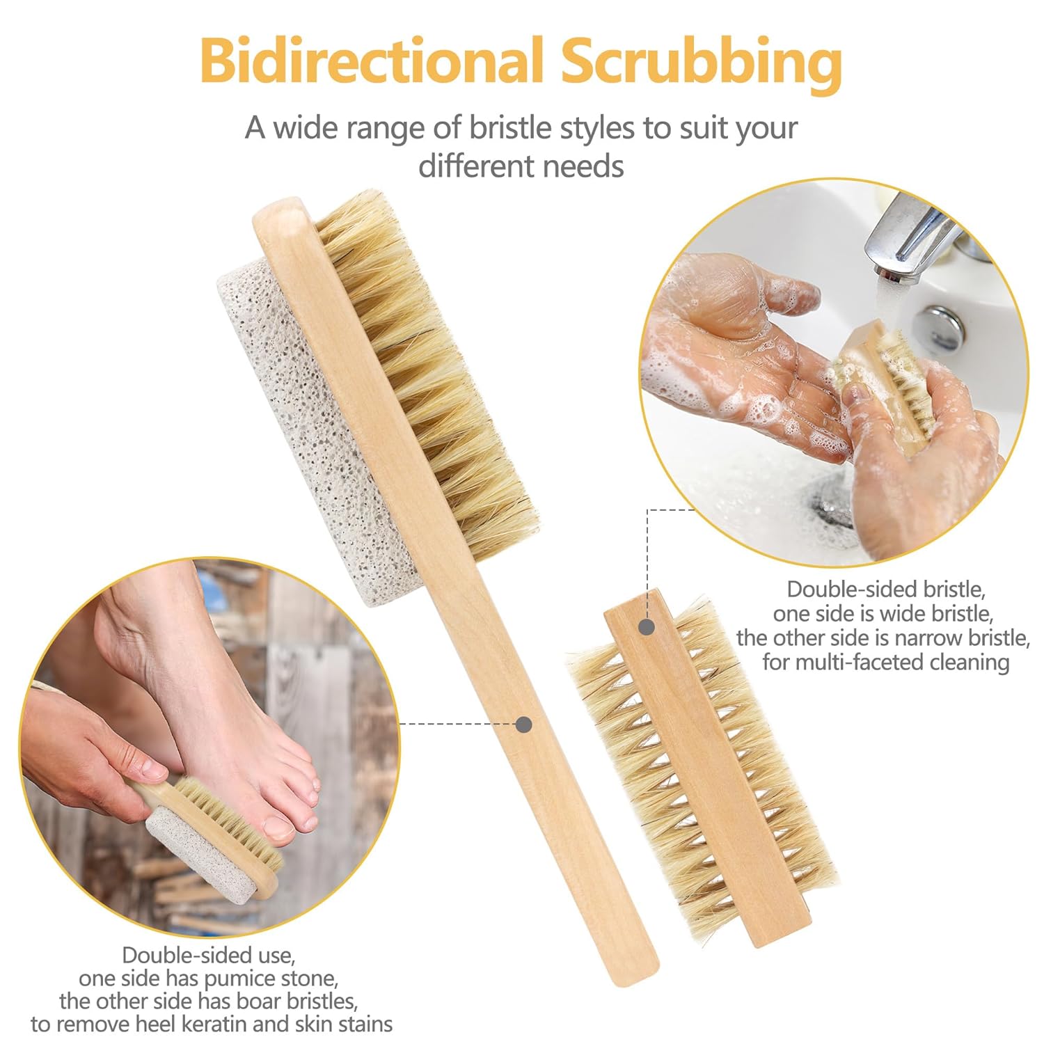 - Double Side Use: Nail scrubber brush: Double-sided with hog bristles. Toe nail brush: With hog bristles + pumice stone